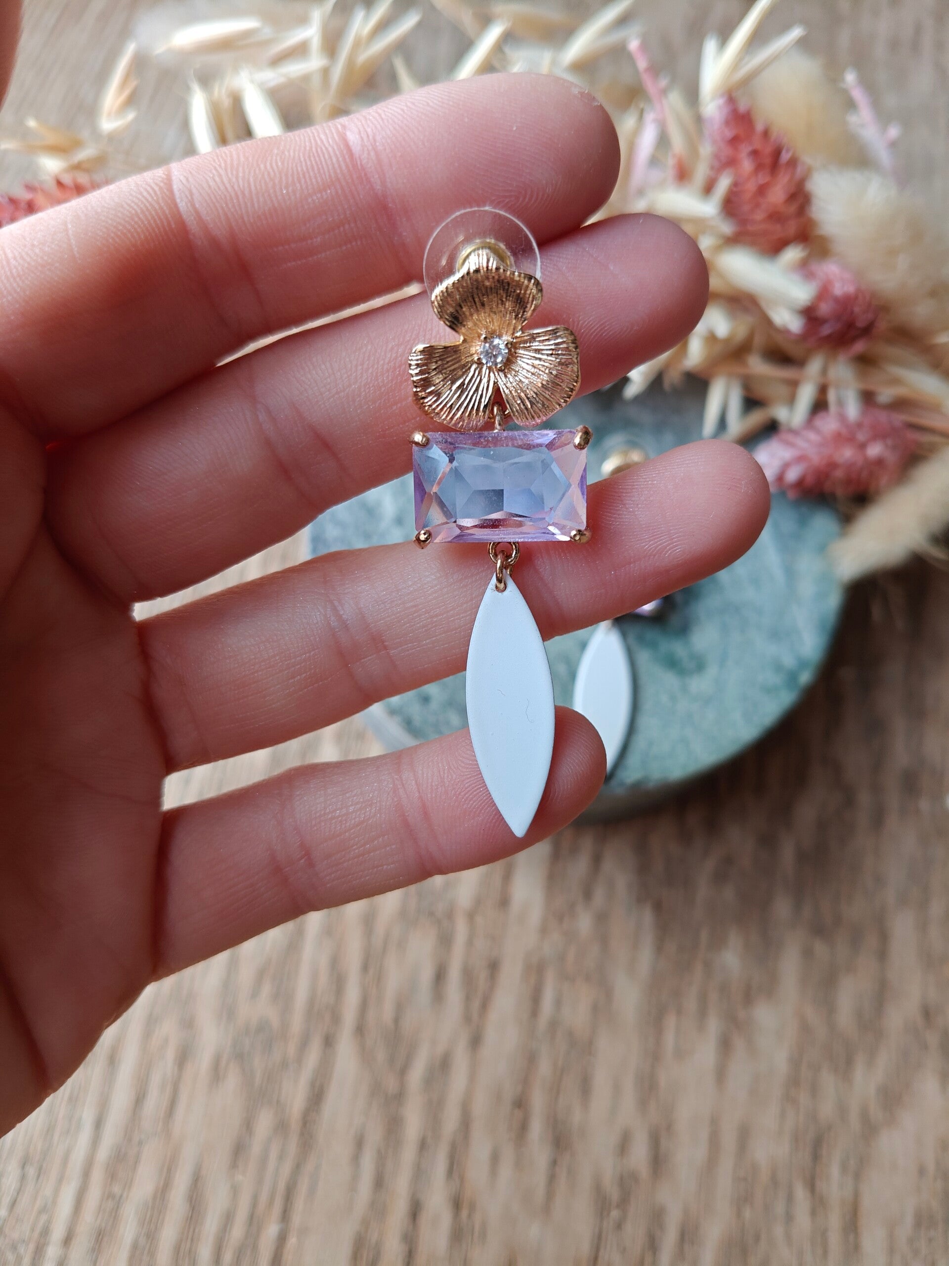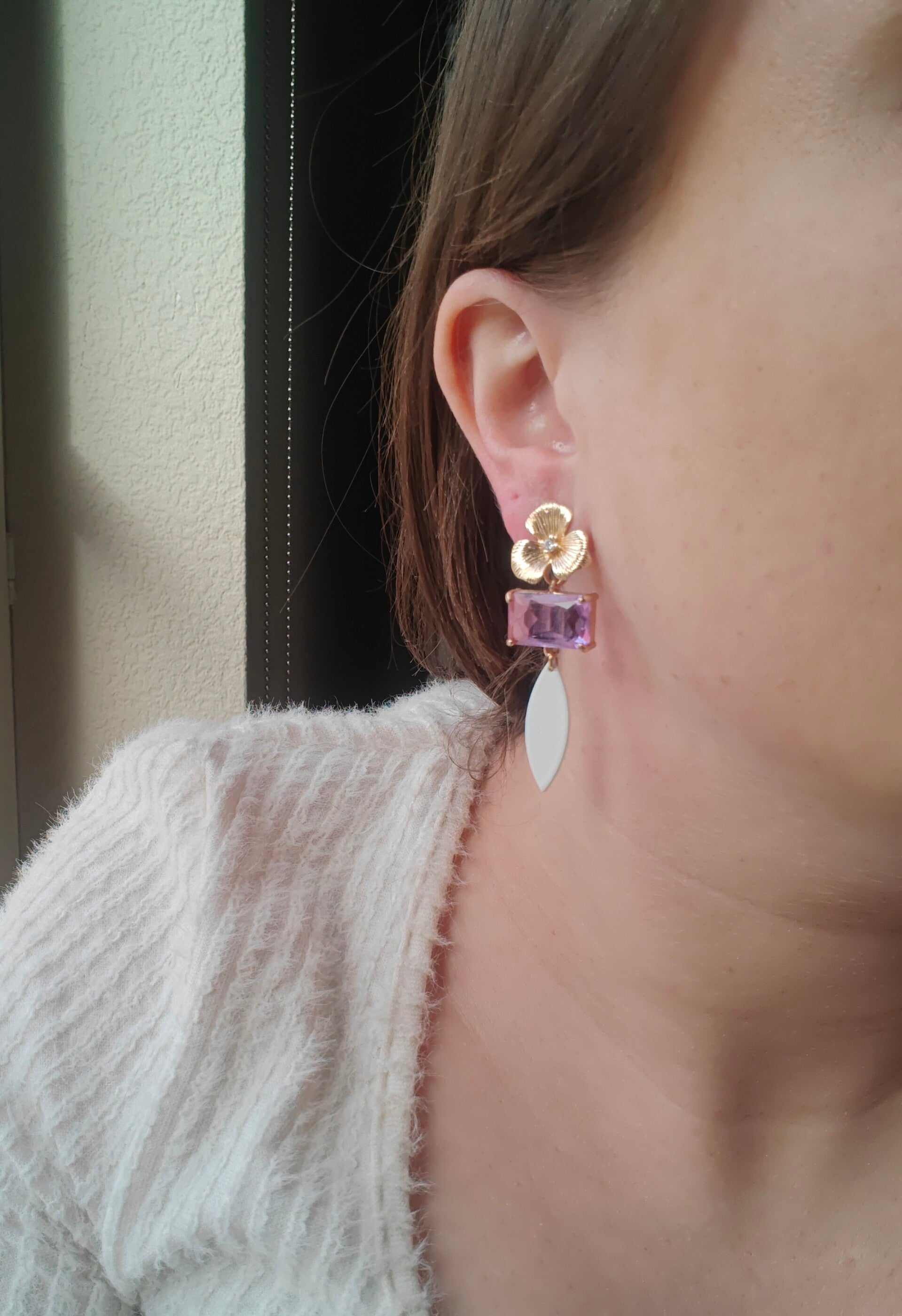 Oorbel PA15; witte hanger met lila steentje en gouden bloemprikker