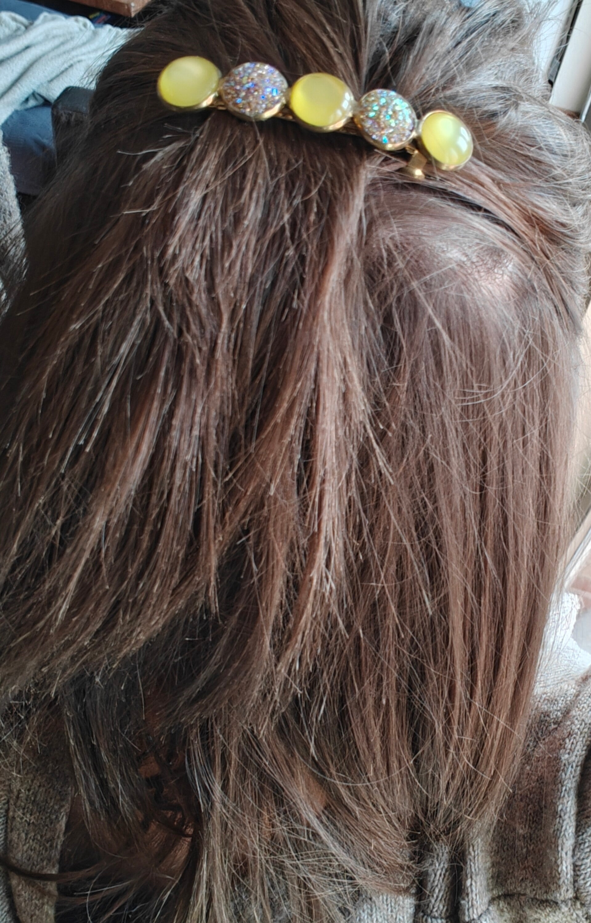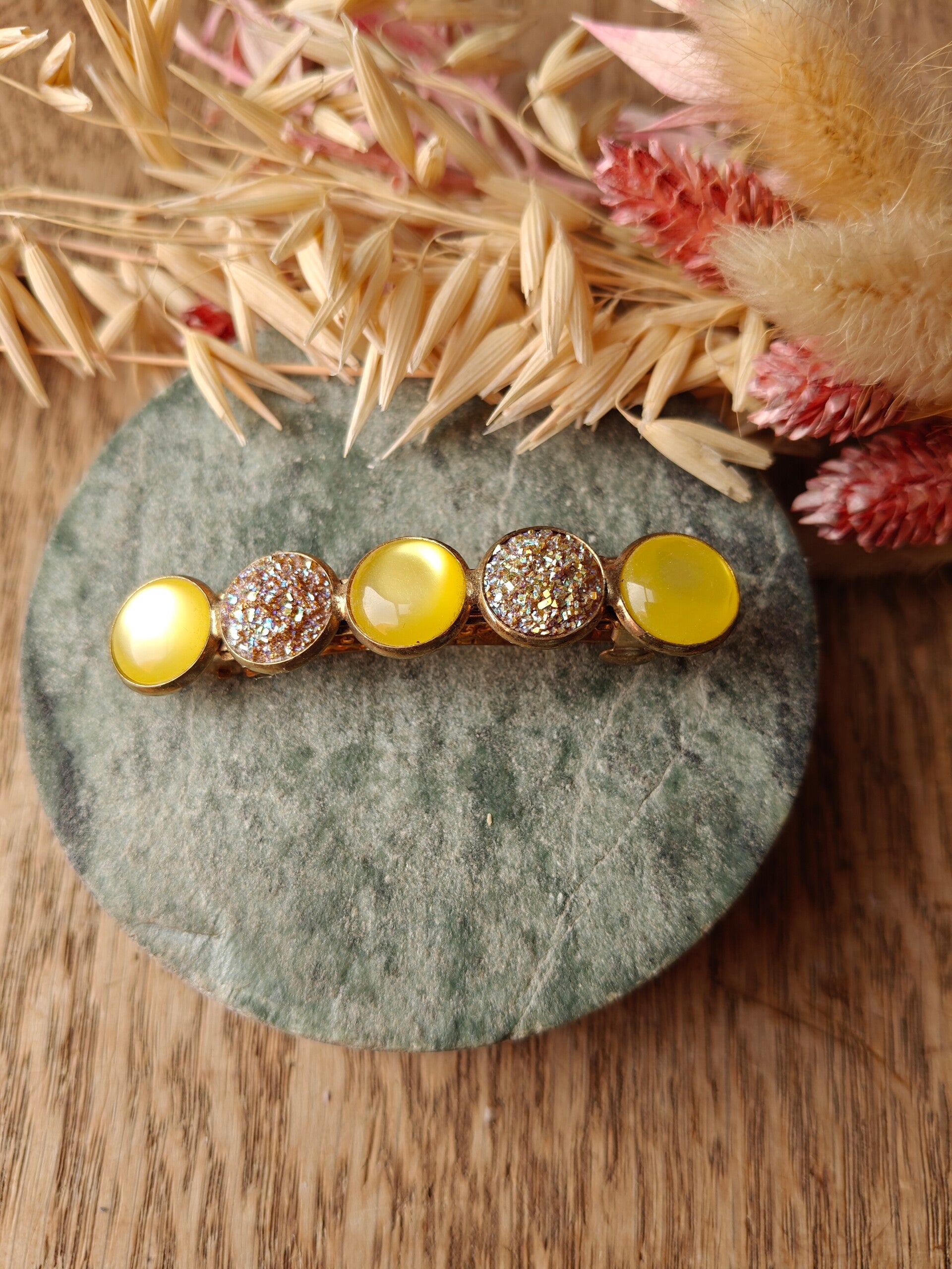 Haarspeld 1: gele haarspeld met gouden bolletjes