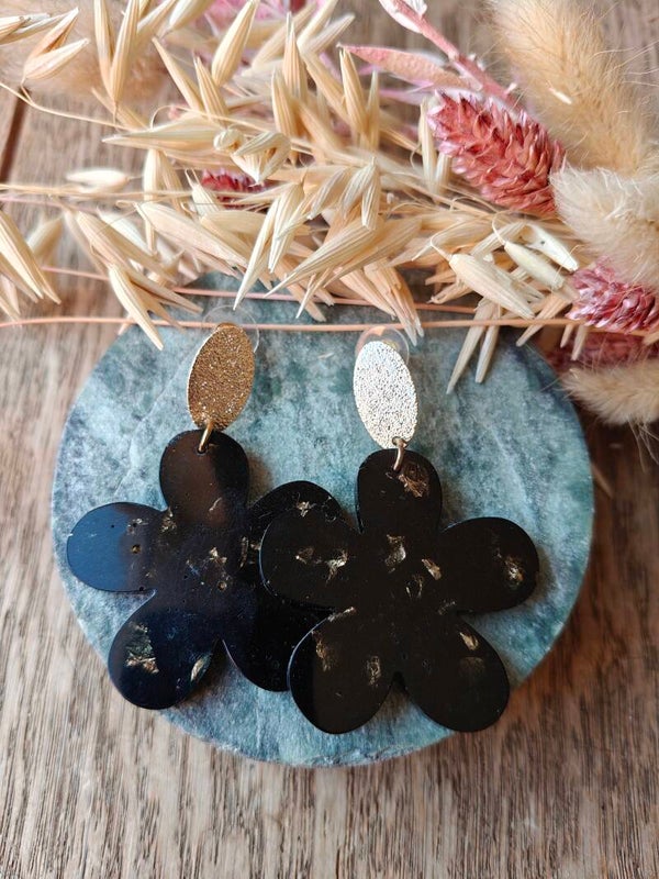 Oorbel ZW1: zwarte bloemenoorbel met gouden spikkels/vlokken