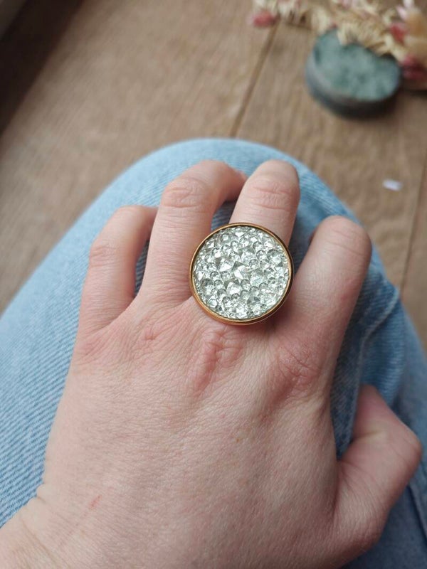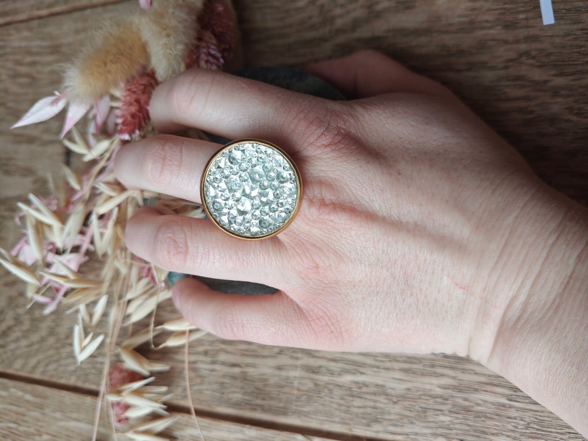 Ring W1: verstelbare transparante/ grijze glitter ring met steentjes