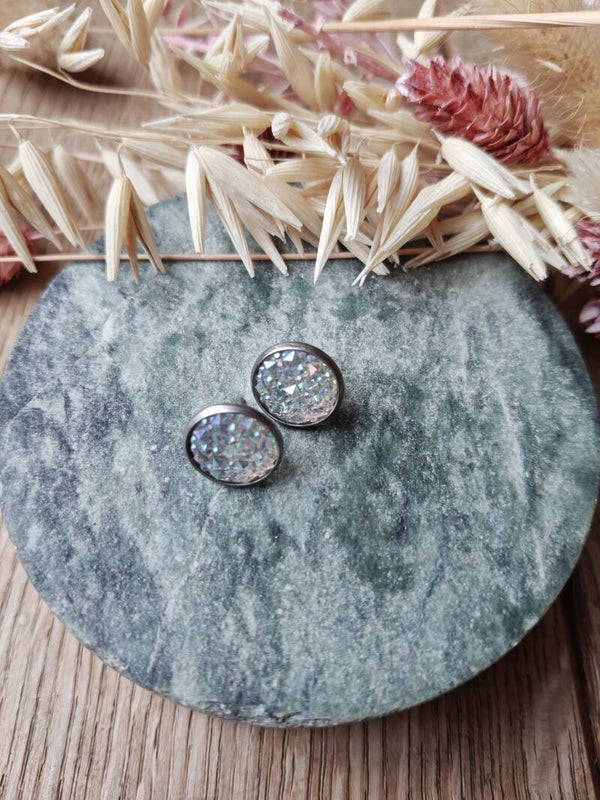 Oorbel KLEIN4: transparante studoorbel met schakering/glitter en zilverkleurige frame