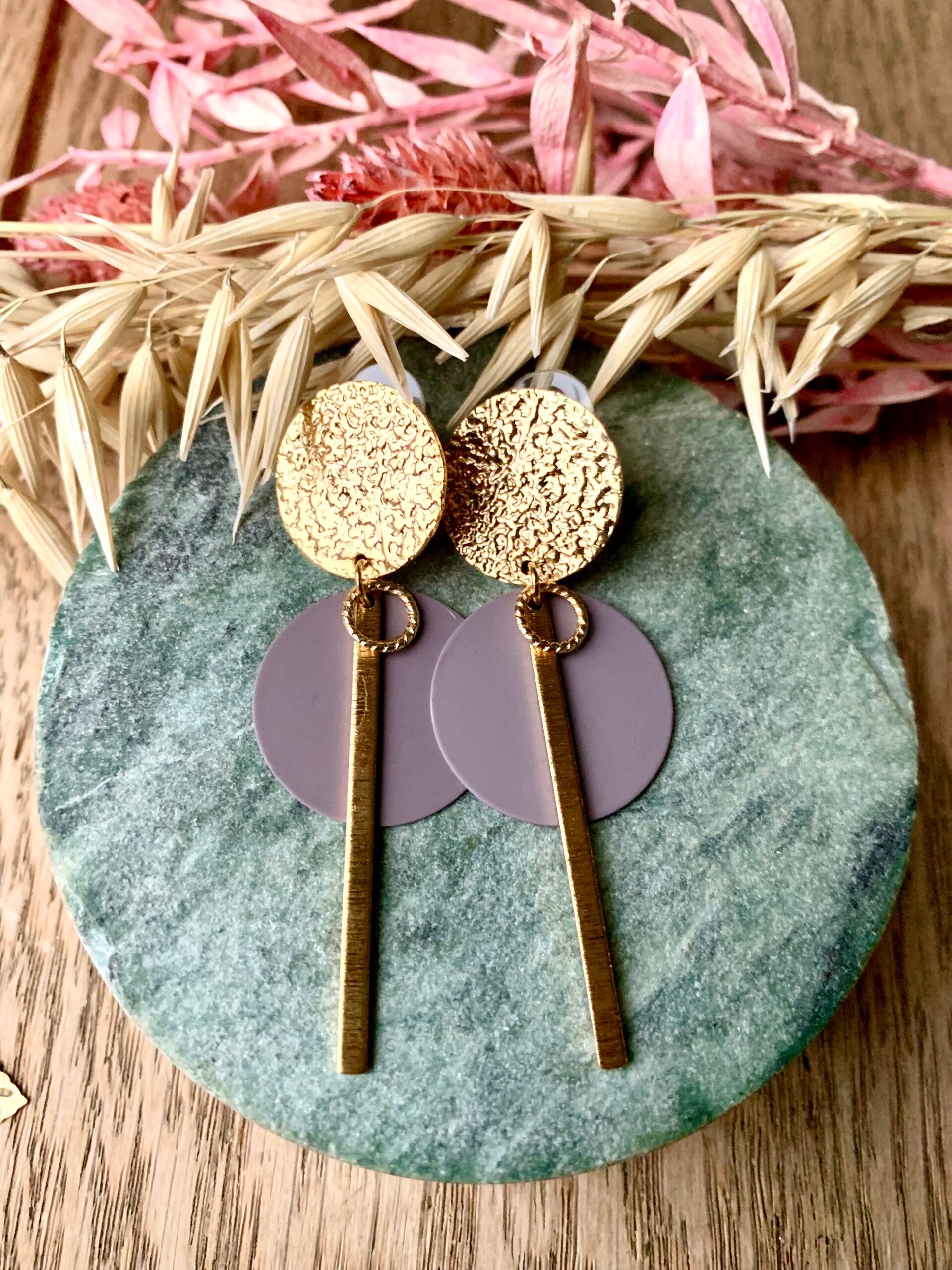 Oorbel: gouden prikker met paars/grijze hanger en staafje