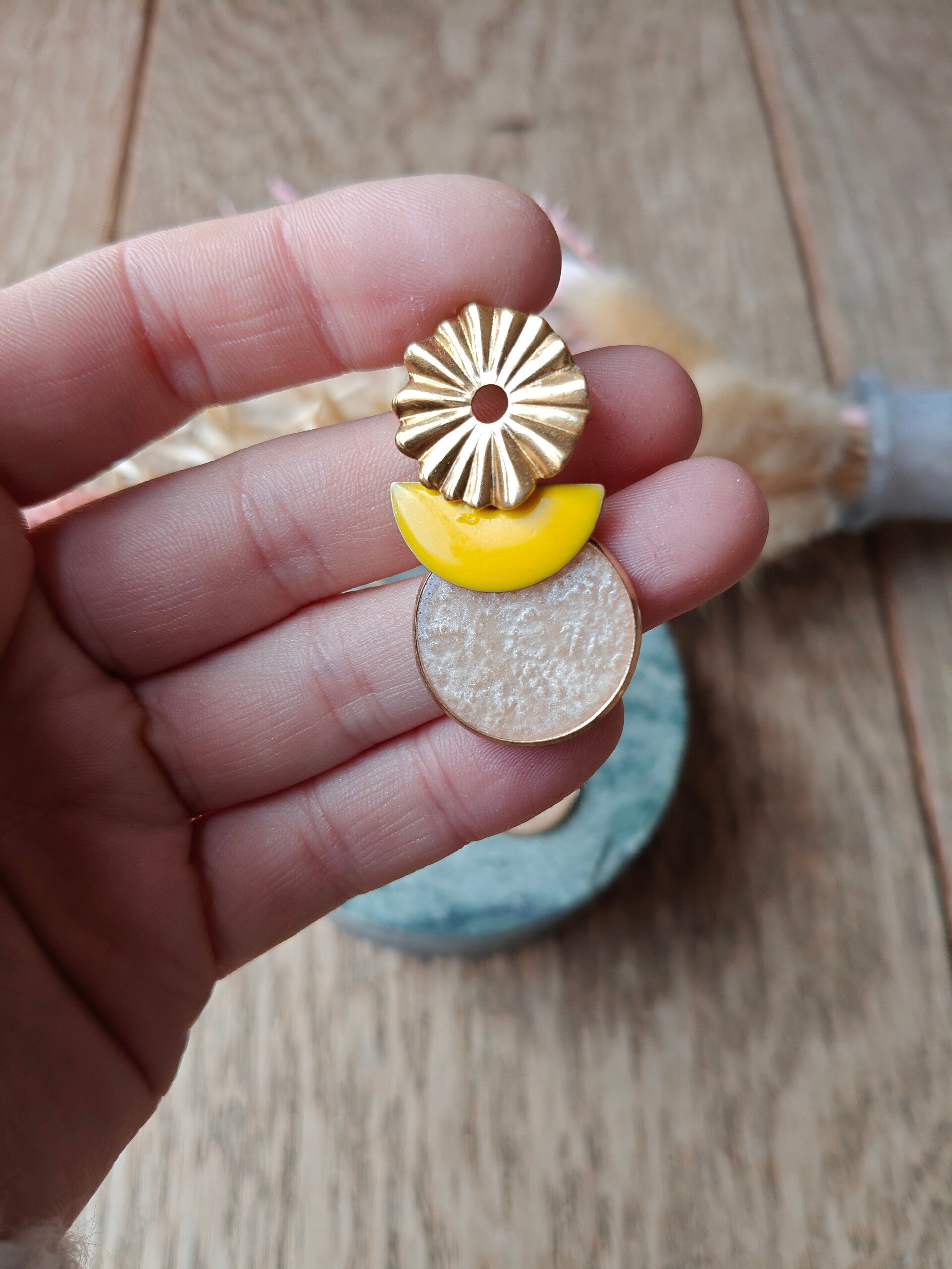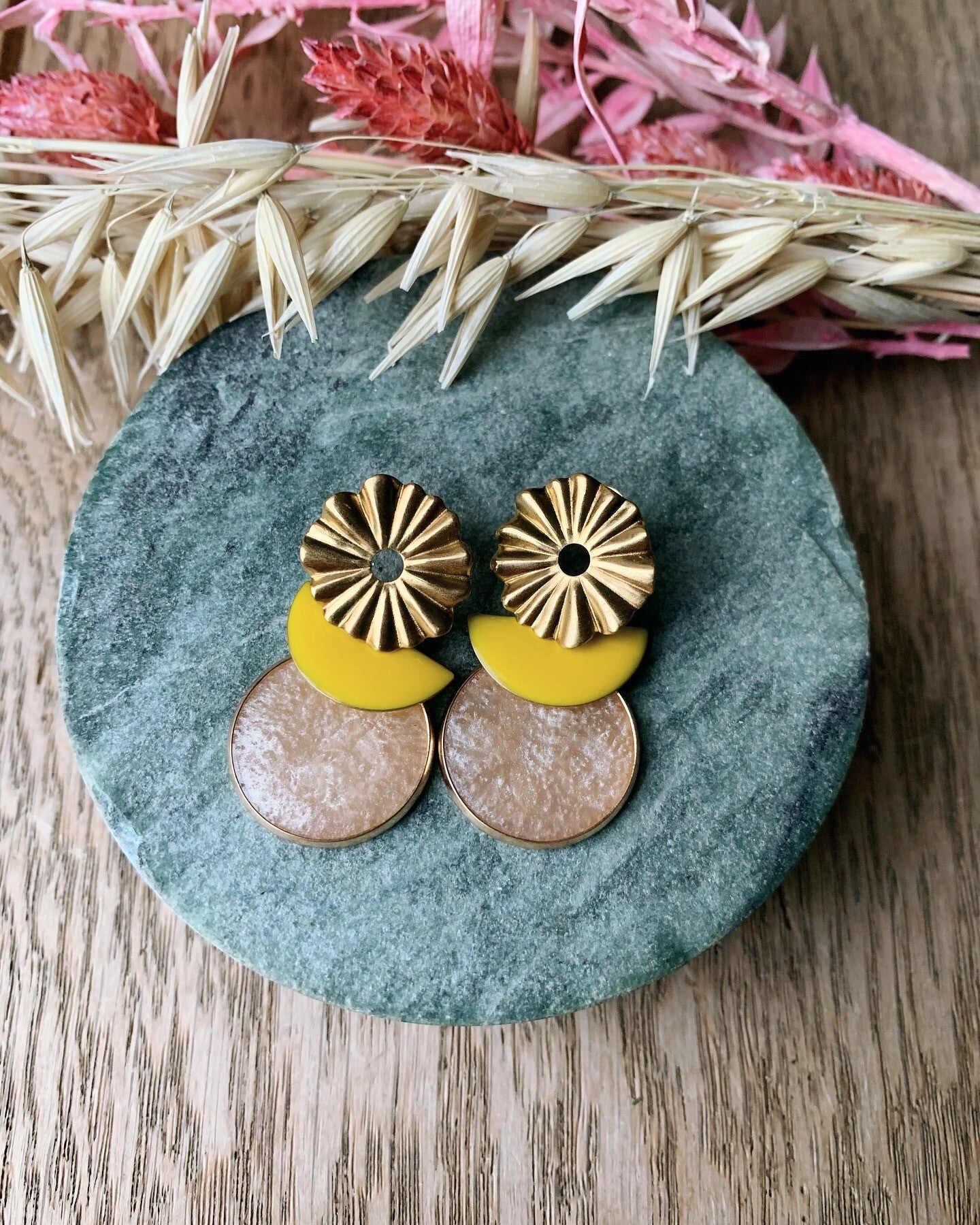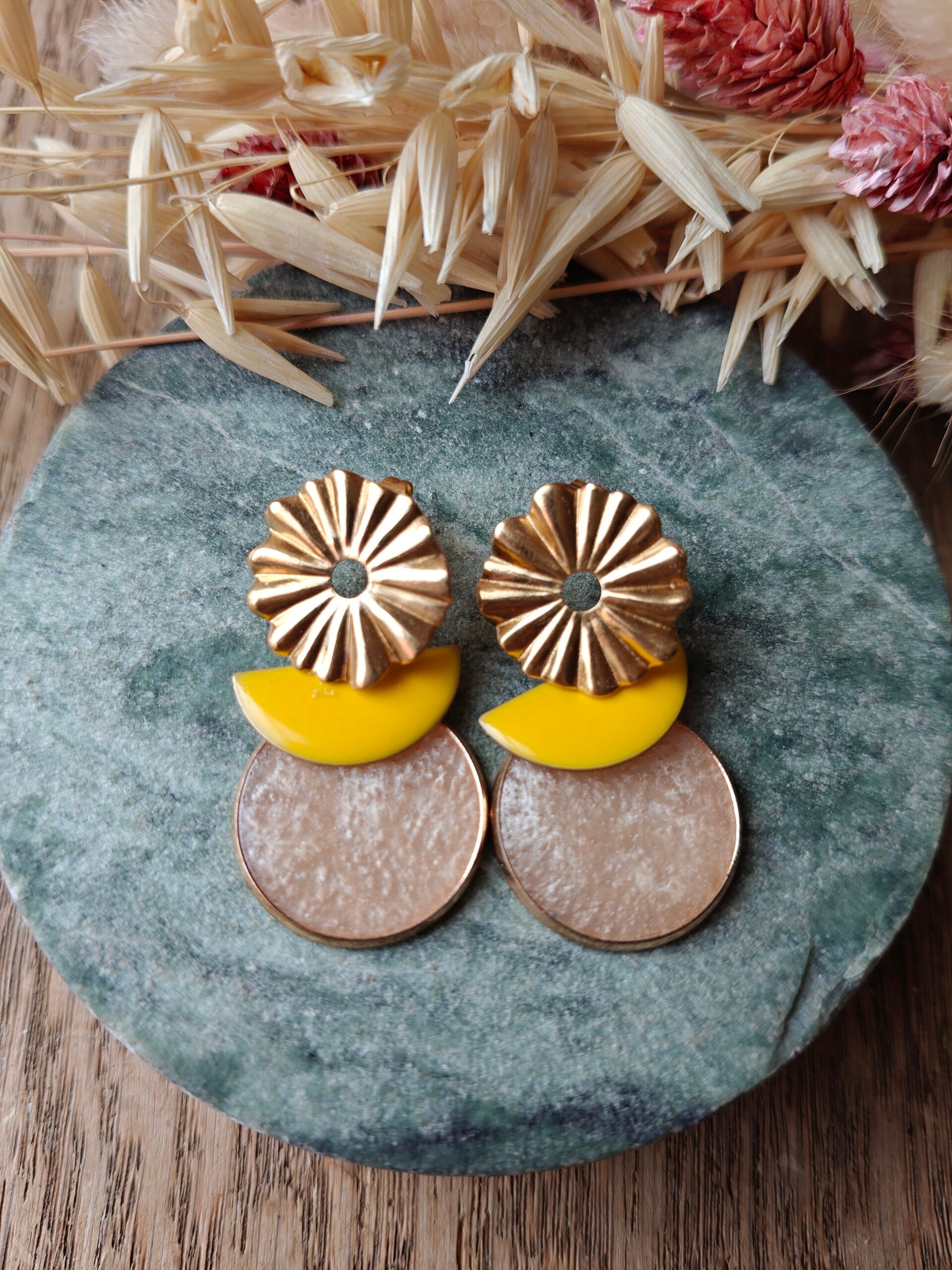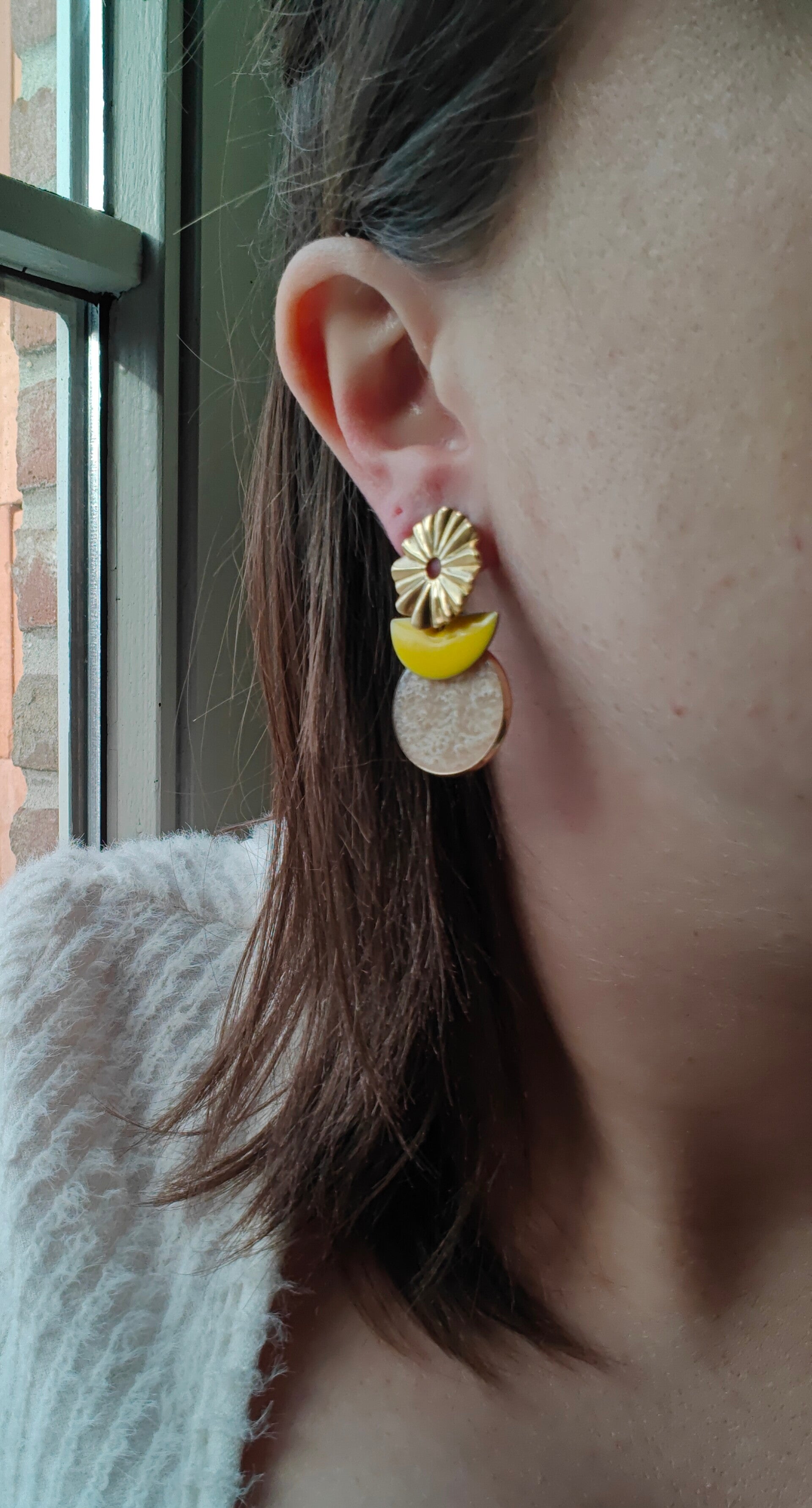 Oorbel GE5: gouden bloemprikker met gele ovalen hanger + wit/beige