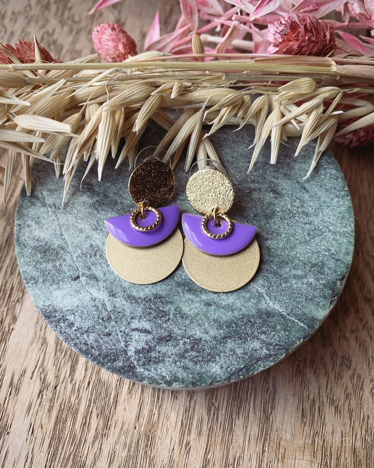 Oorbel: gouden prikker met paarse hanger