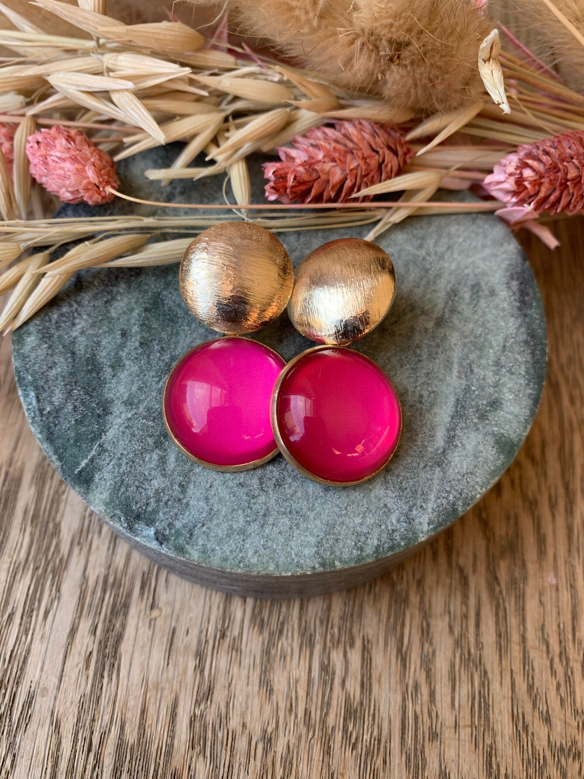 Oorbel: felroze oorbel met gouden prikker