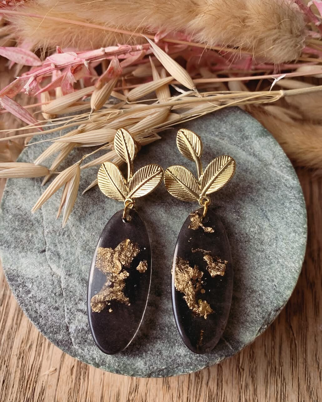 Oorbel ZW16: zwarte hanger met bladgoud