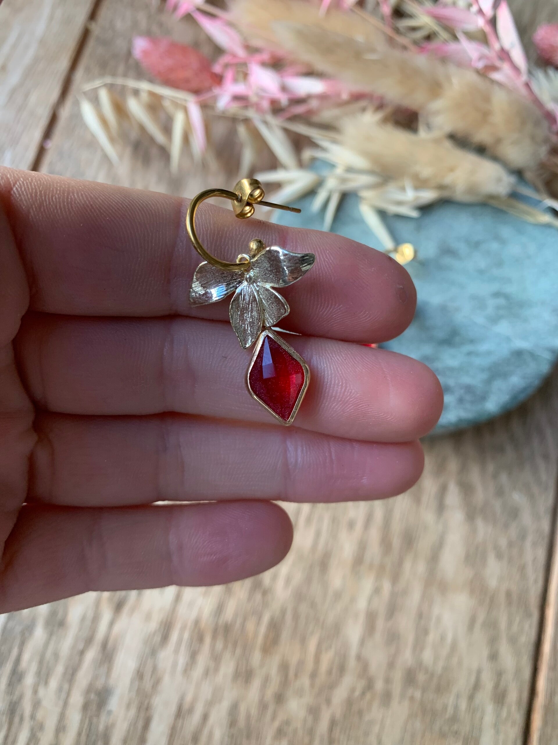 Oorbel R7: rode hanger met bloem aan ringprikker
