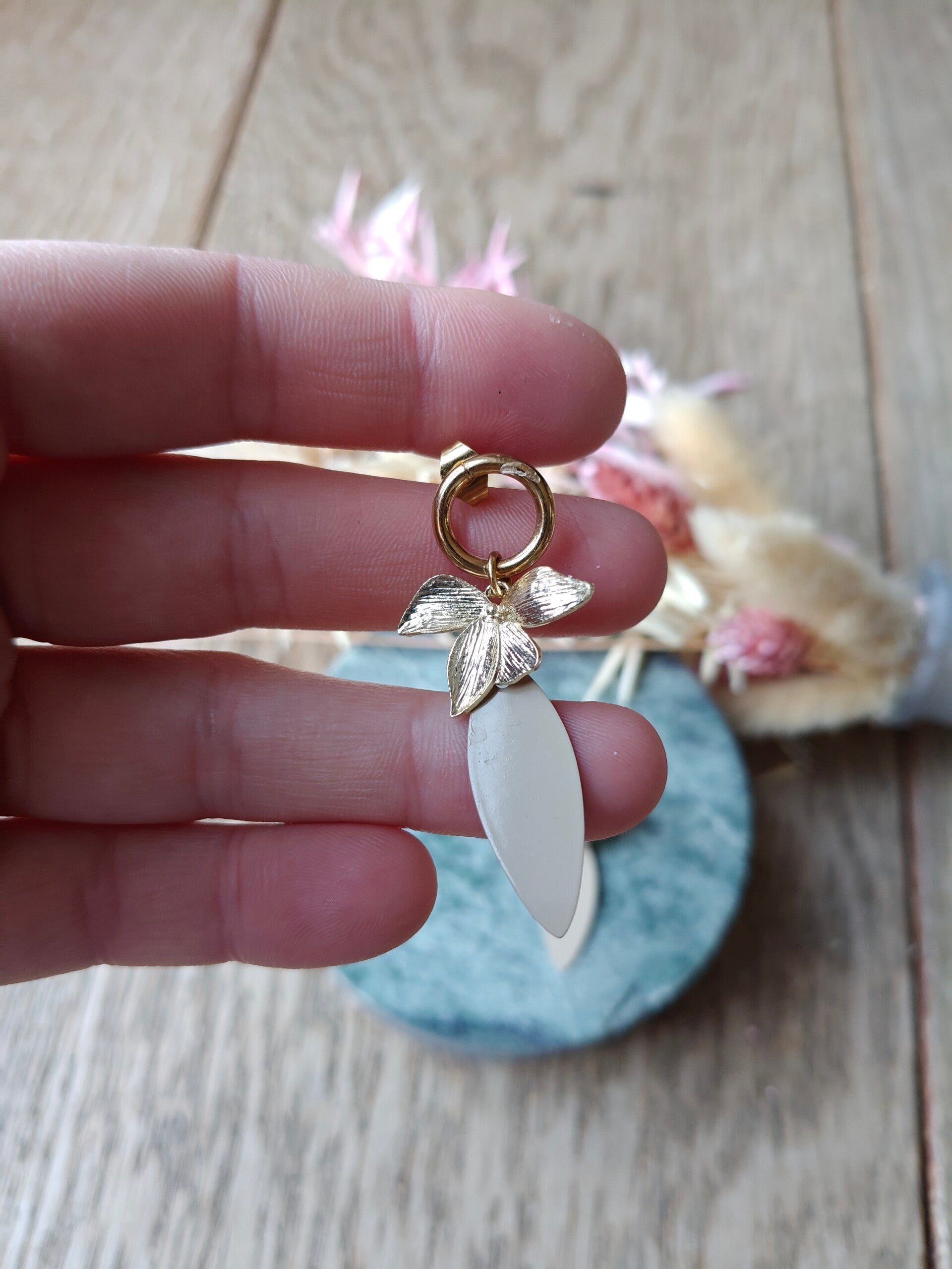 Oorbel BR10: beige druppelhanger met gouden prikker