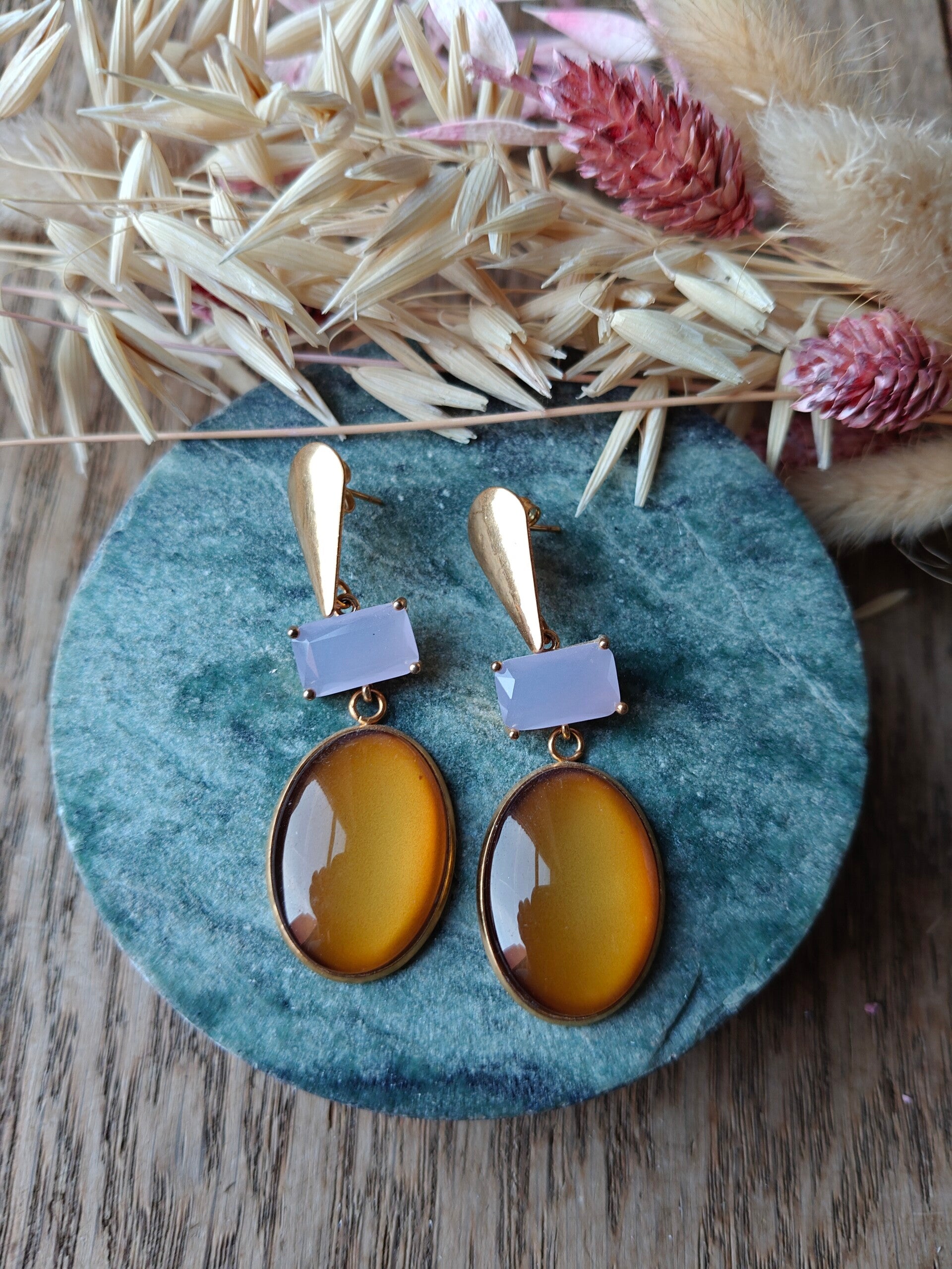 Oorbel BR6: bruine hanger met lichtpaarse steen