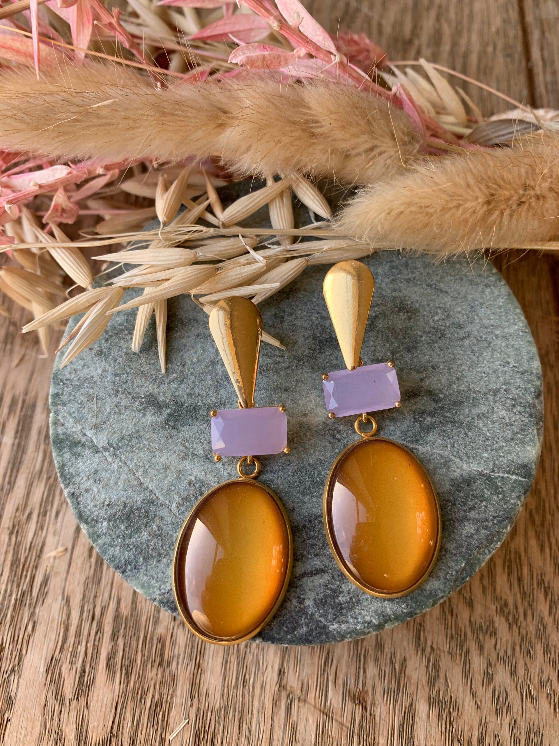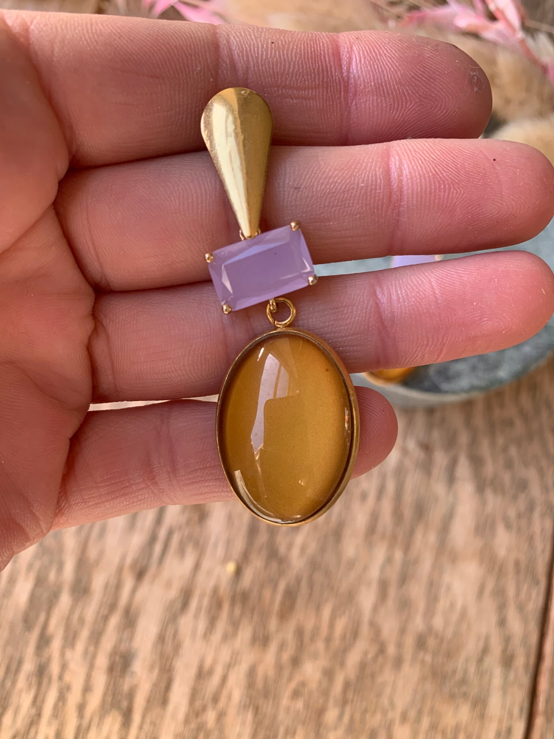 Oorbel BR6: bruine hanger met lichtpaarse steen