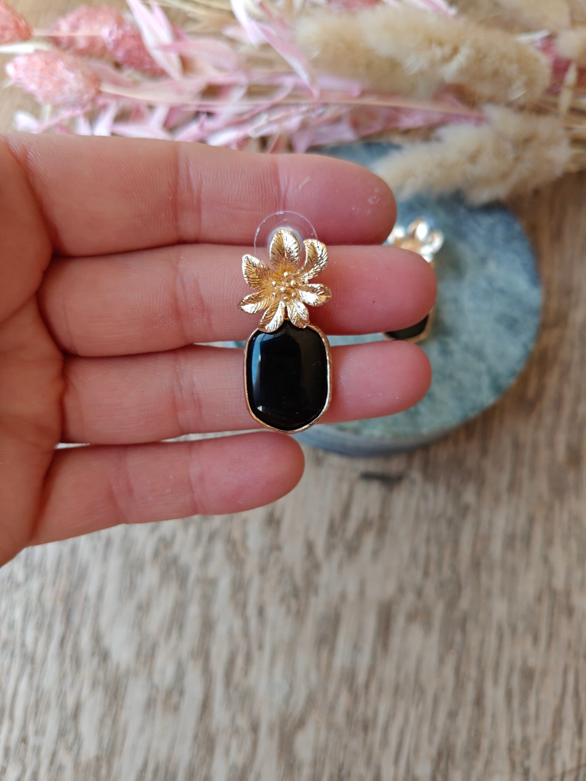 Oorbel: kleine zwarte oorbel met gouden bloemprikker