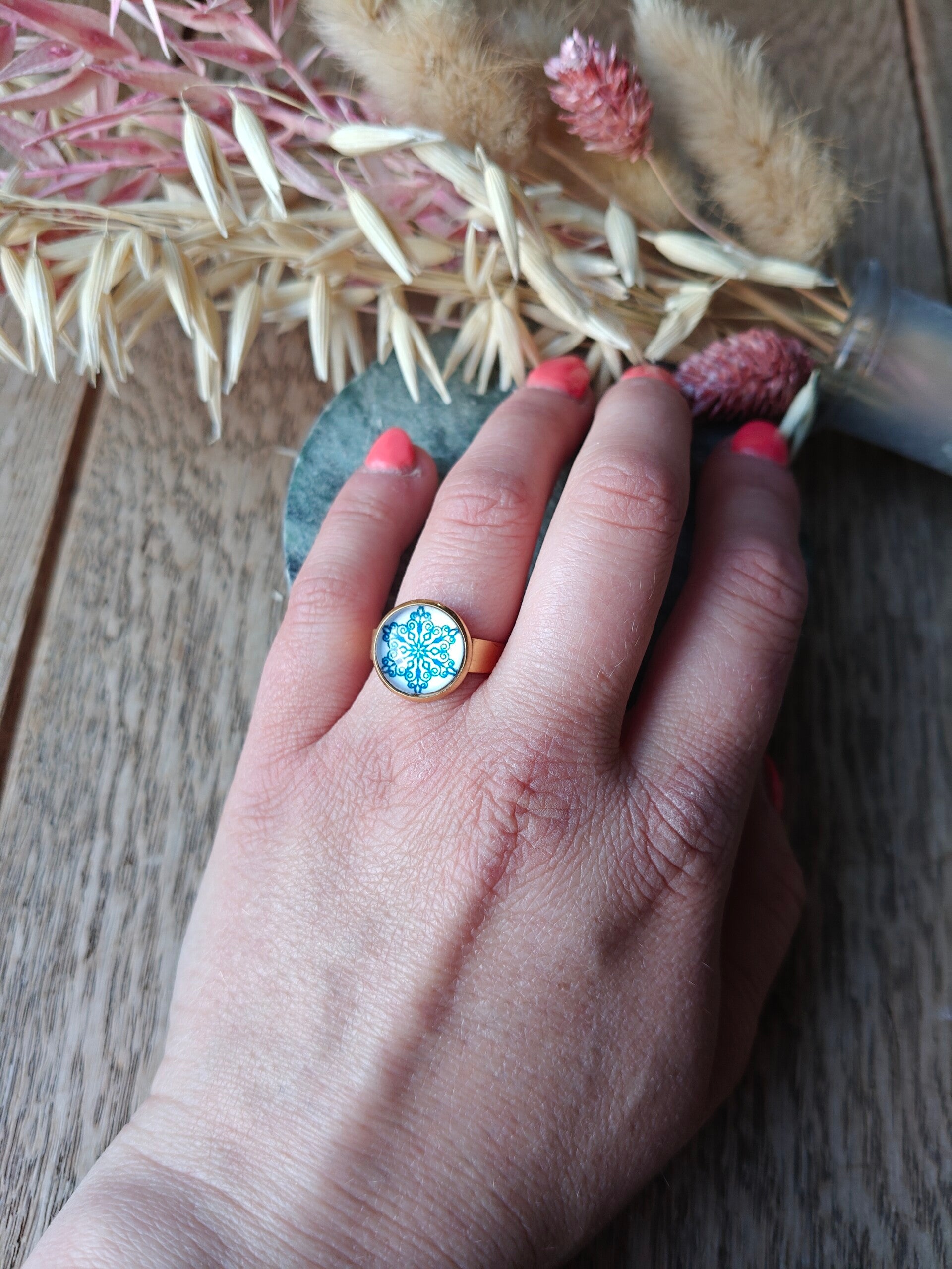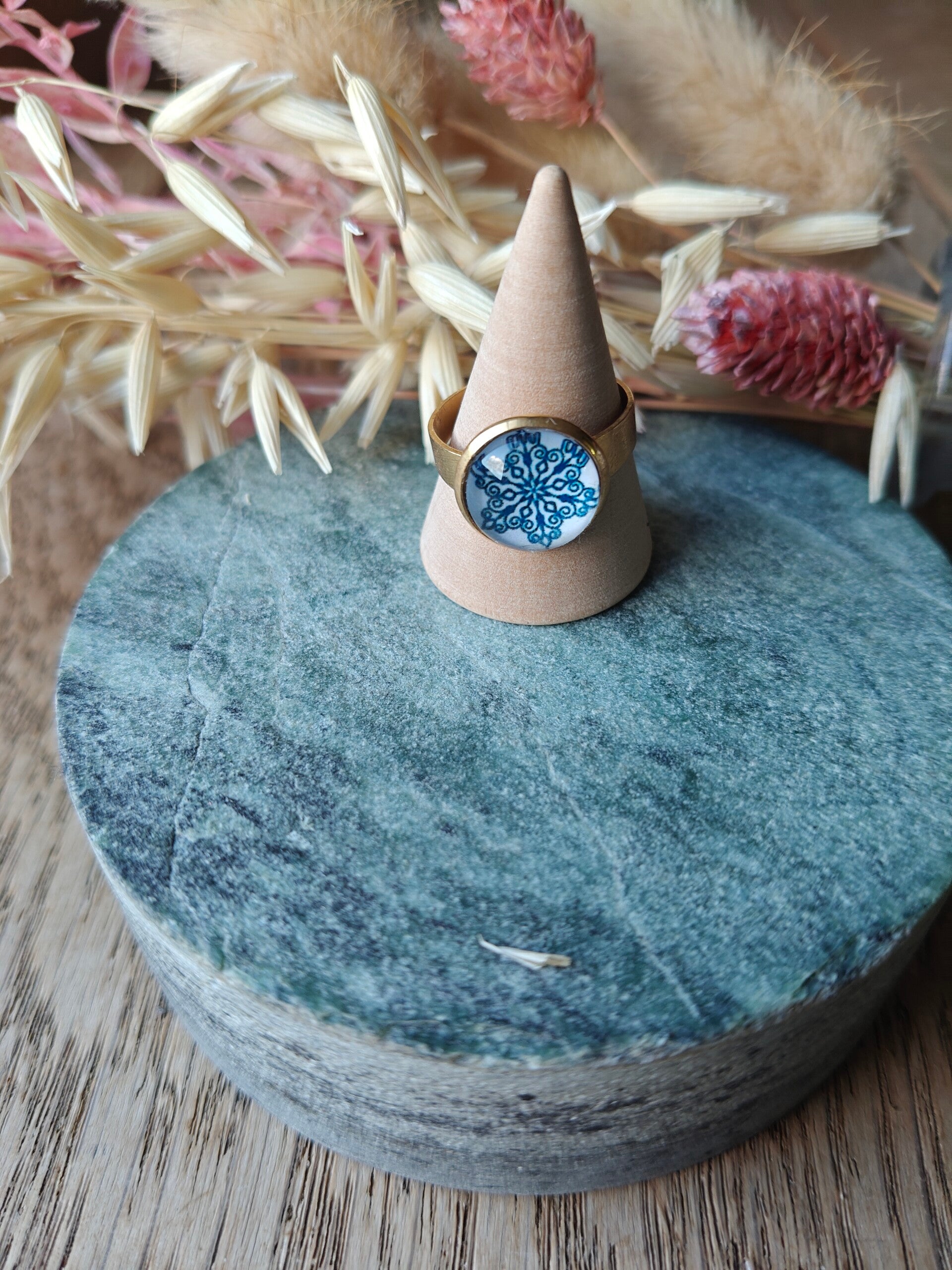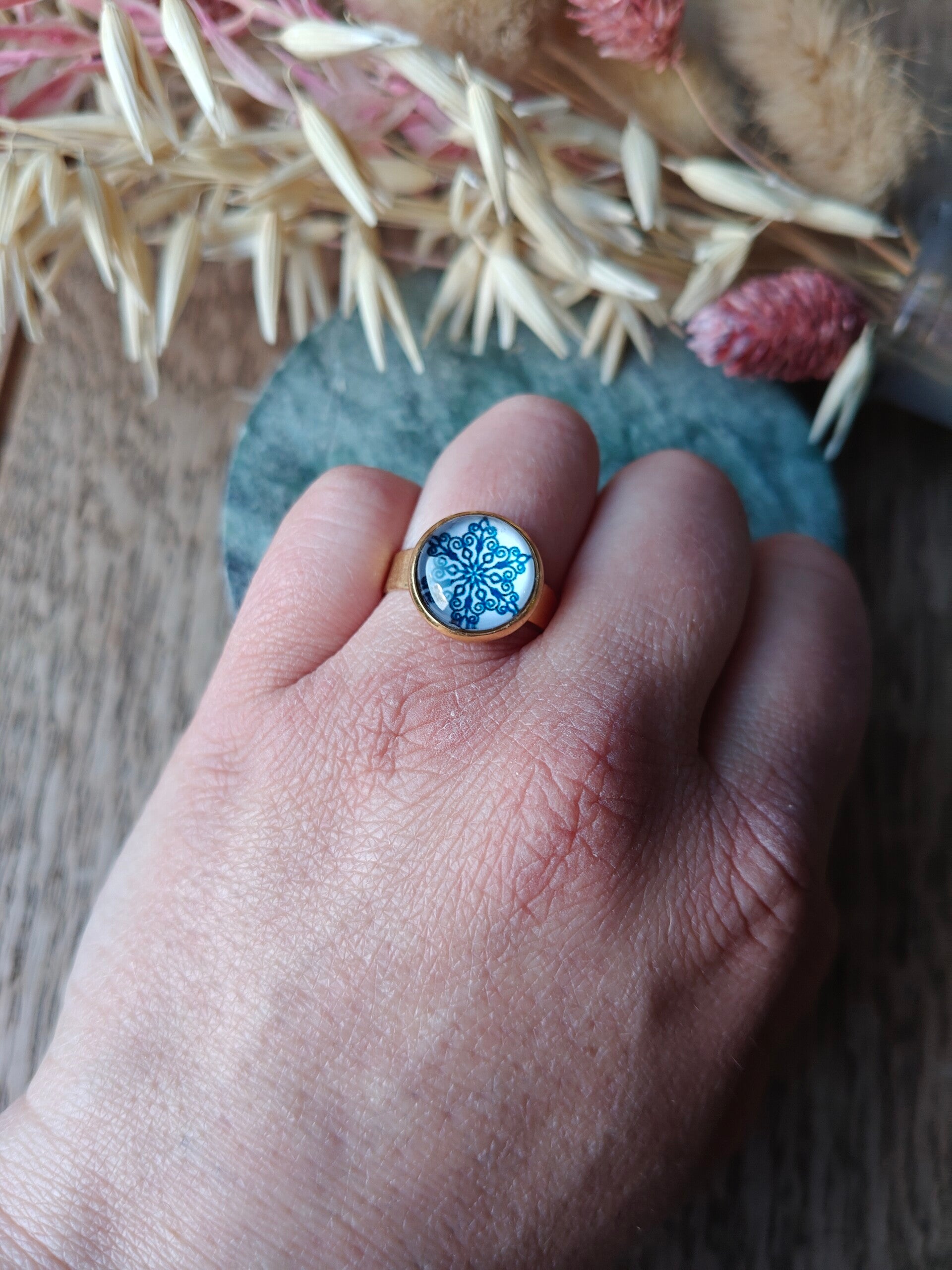 Ring: verstelbare ring met blauwe bloem en witte achtergrond
