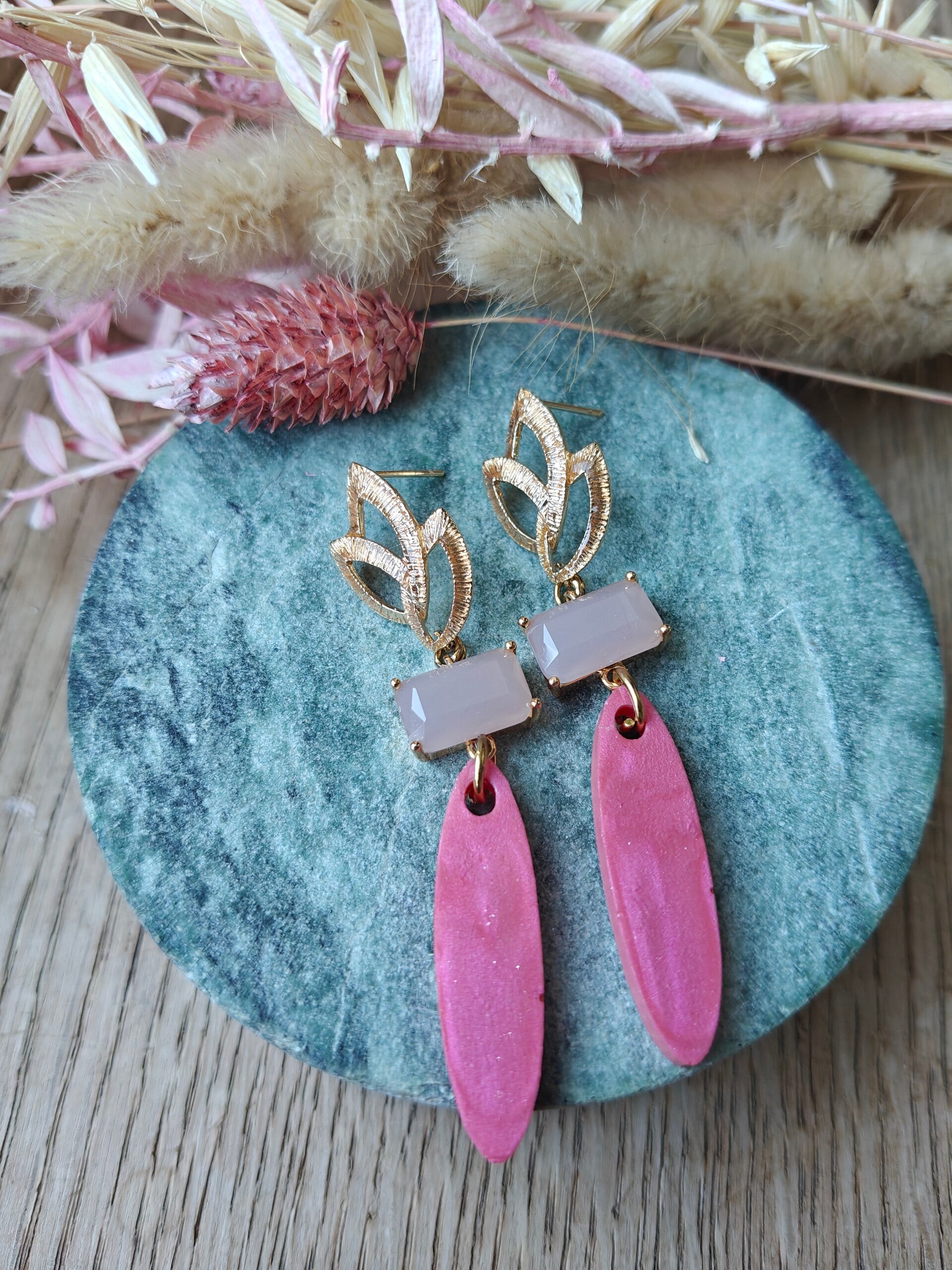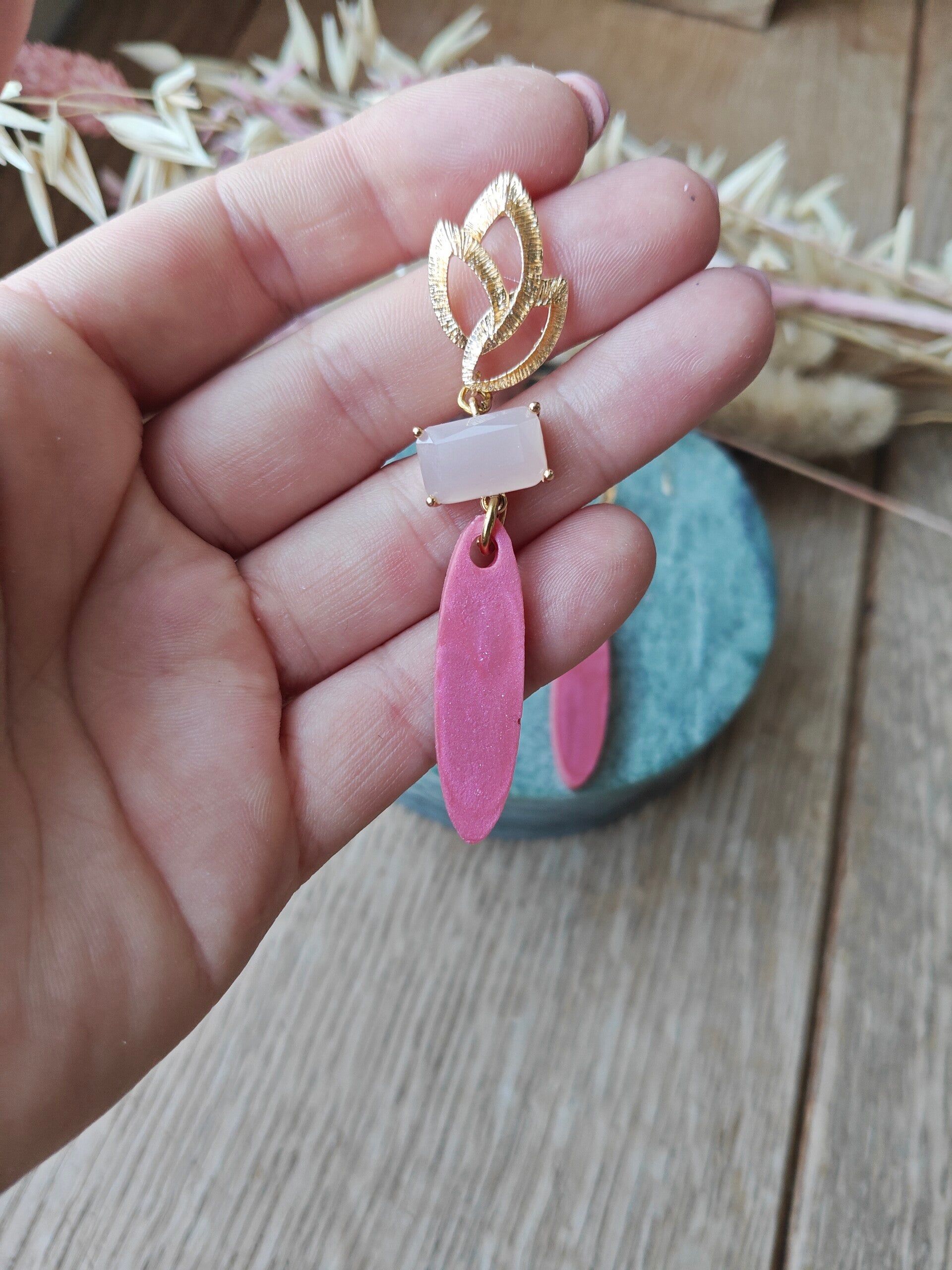 Oorbel ROZ1: roze hanger met gouden prikker en mat roos steentje