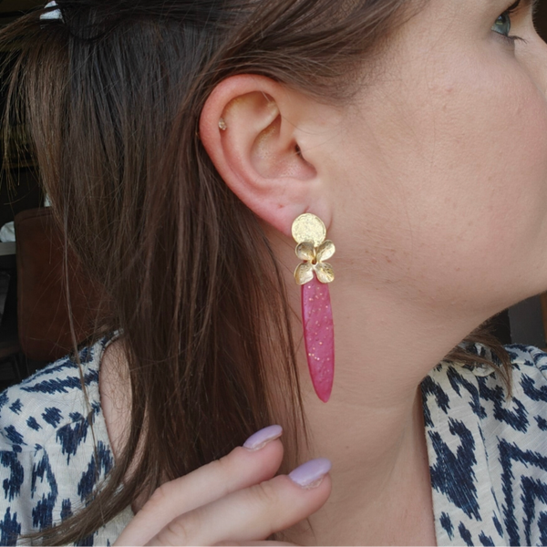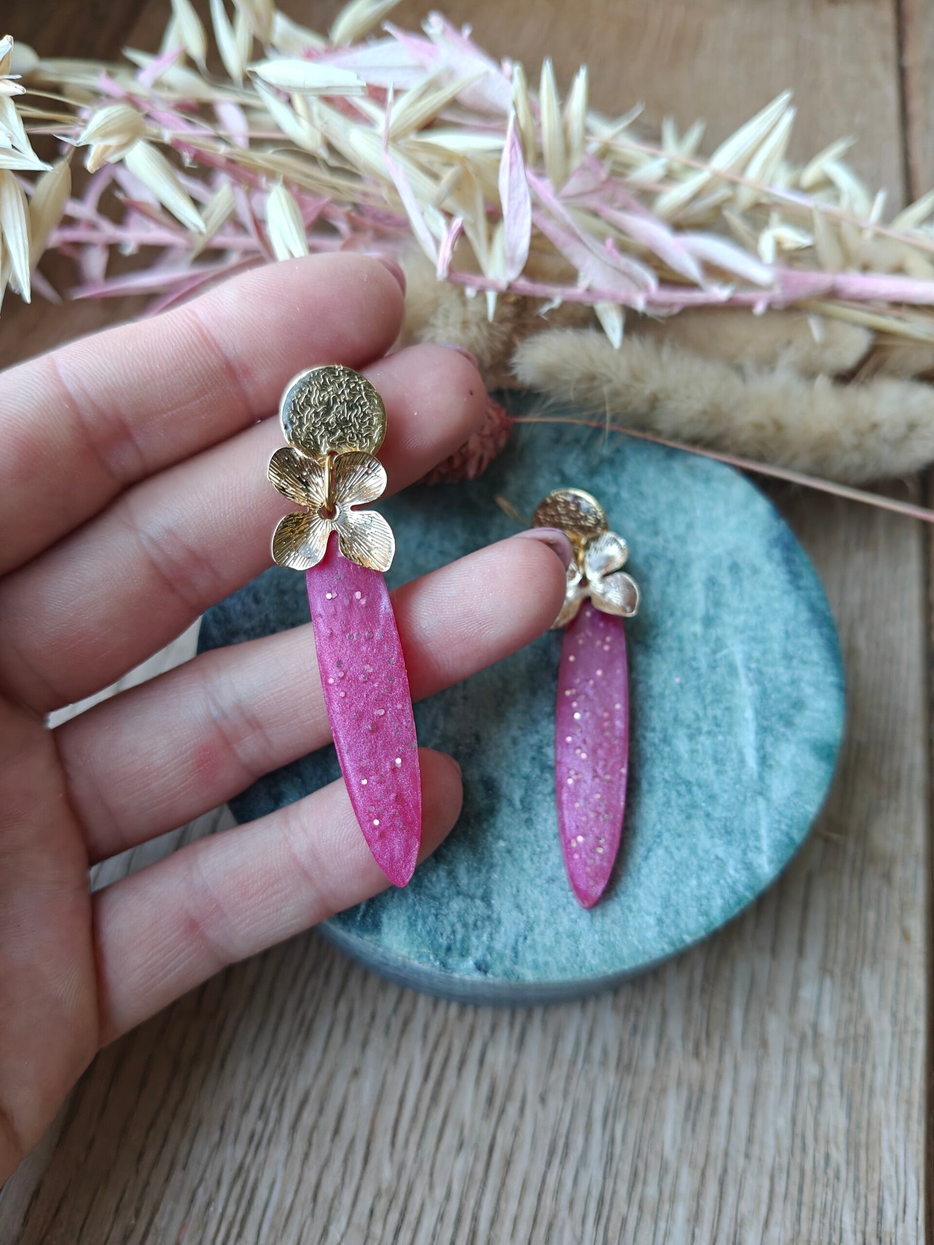 Oorbel ROZ2: roze glitter hanger met gouden prikker