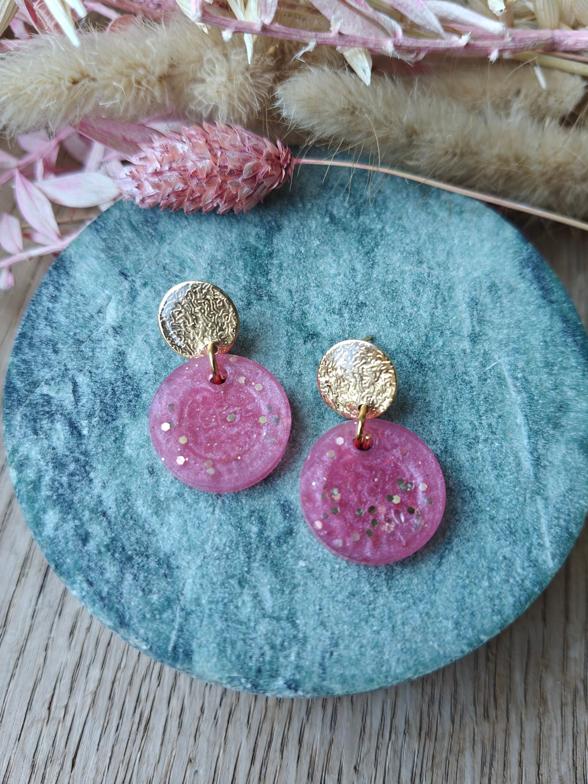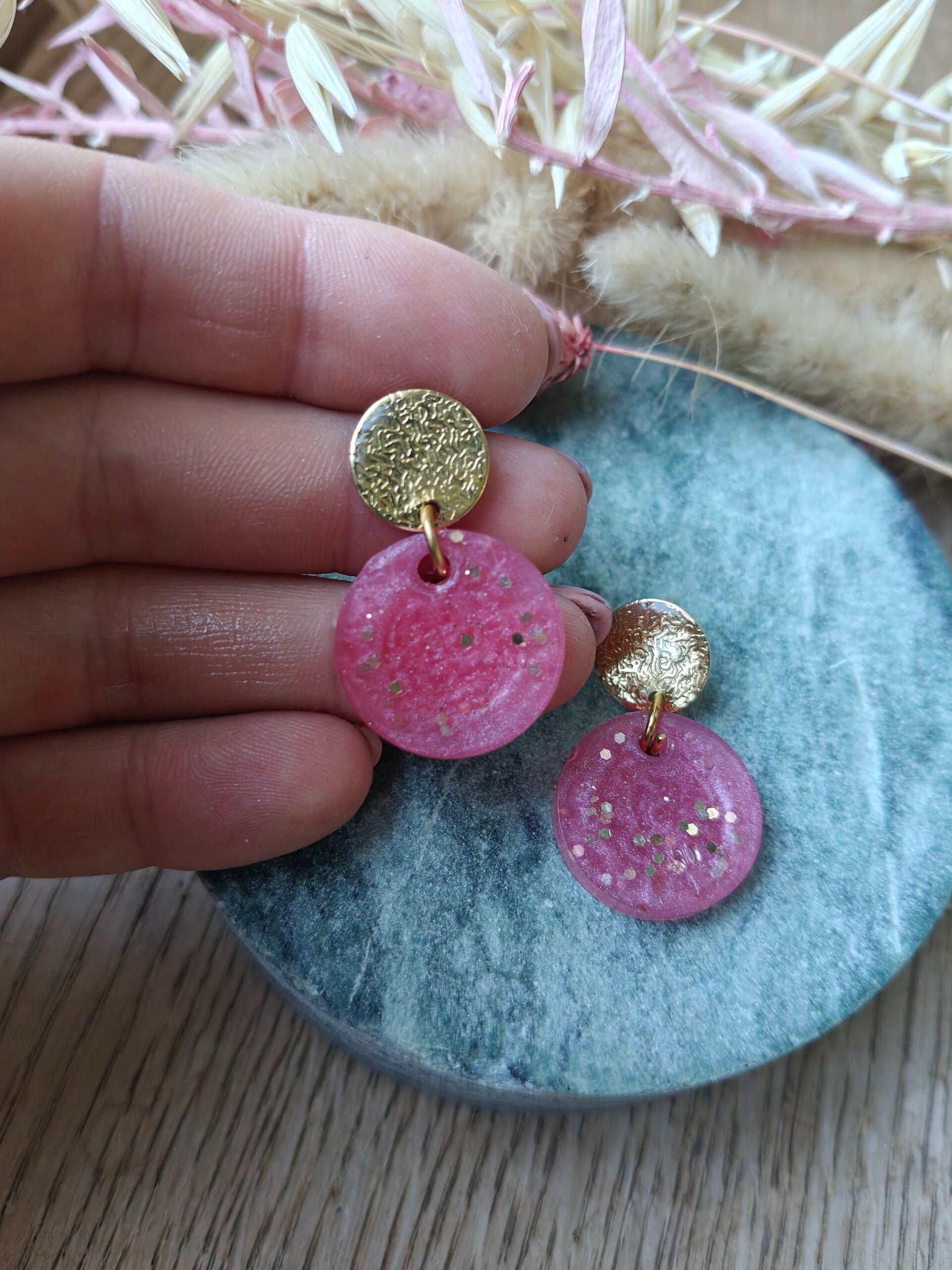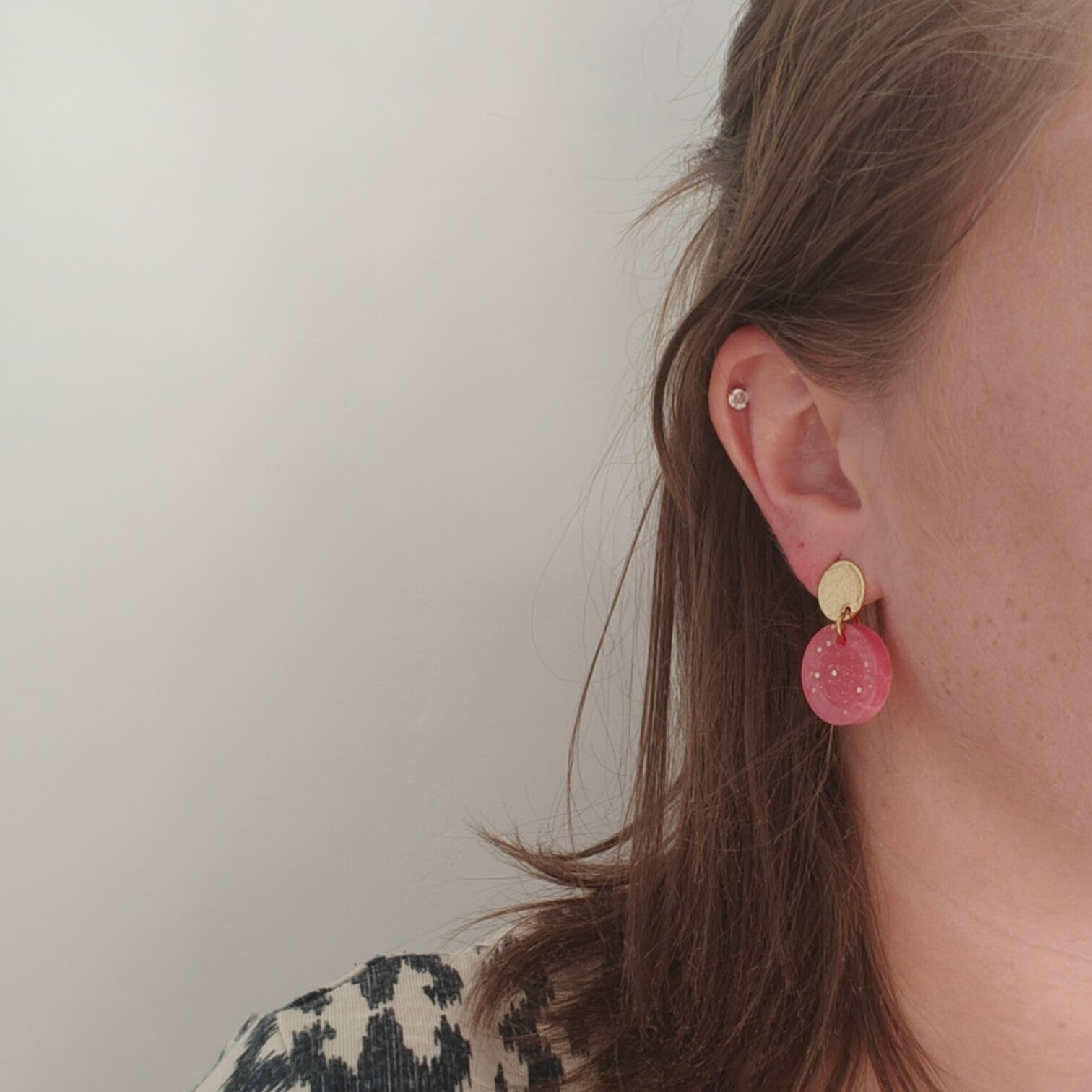 Oorbel ROZ3: kleine roze cirkelvormige oorbel met gouden prikker