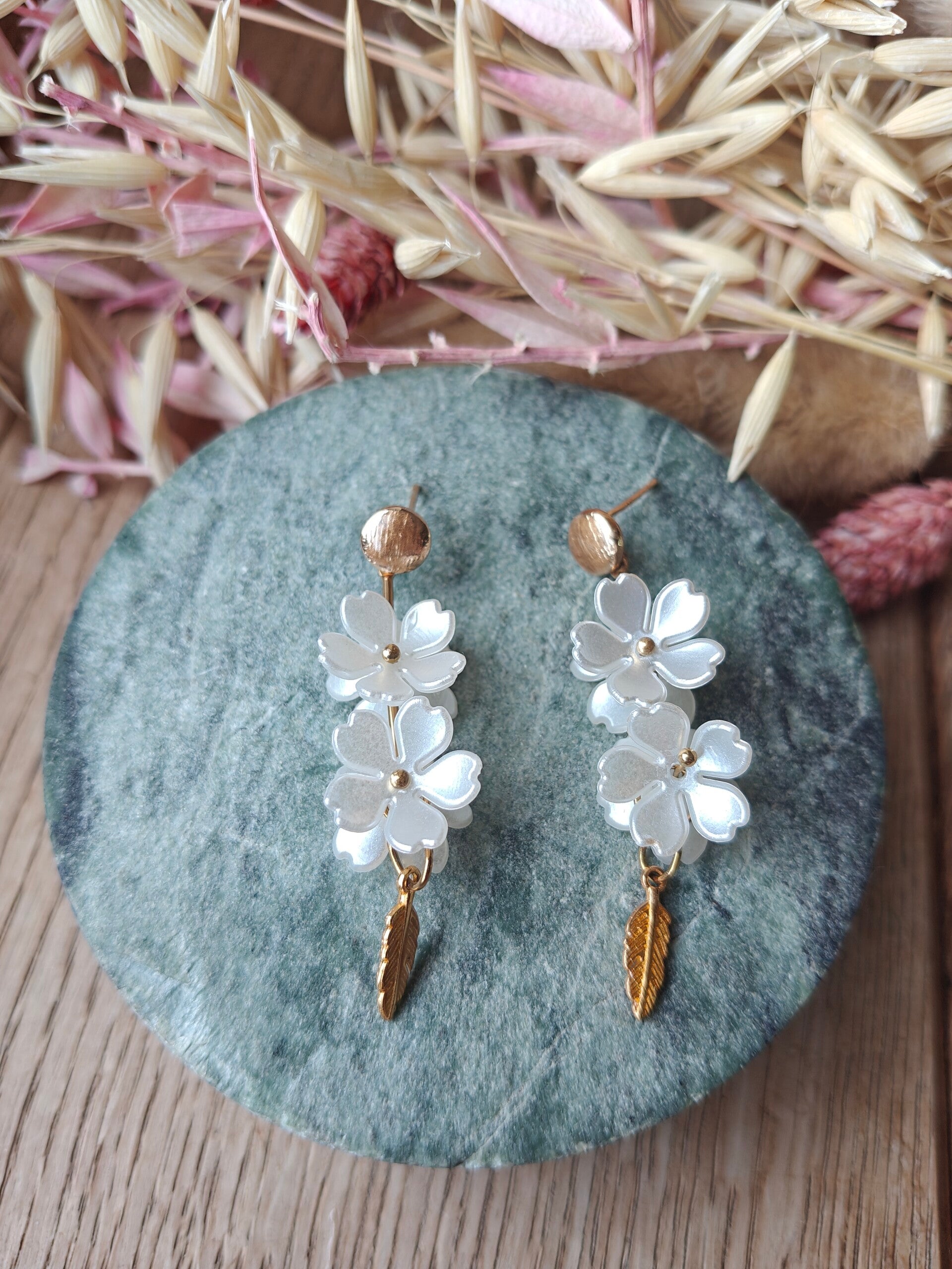 Laat je stijl bloeien met deze verfijnde bloemoorbellen, ontworpen om op te vallen zonder in te boeten aan comfort. De oorbellen bestaan uit drie subtiele bloemetjes met een gouden accentje in het midden en een elegant bladvormig hangertje. Gemaakt van hoogwaardige materialen die roestvrij en hypoallergeen zijn – perfect voor gevoelige oren en langdurig draagplezier.