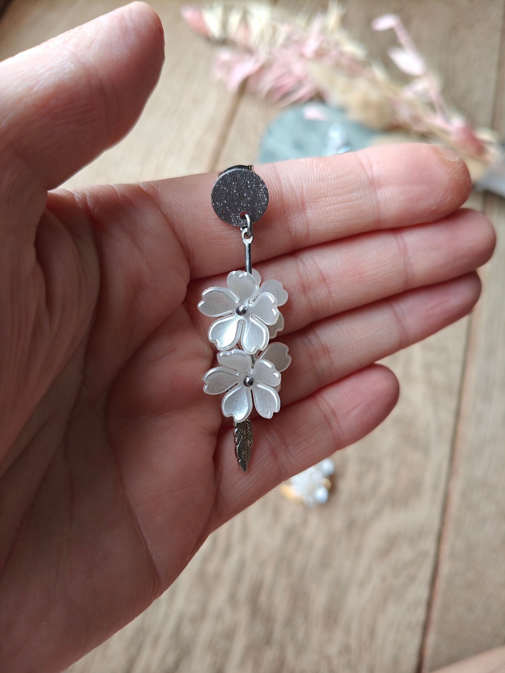 Oorbel W1: witte bloemoorbel met zilveren prikker en veertje