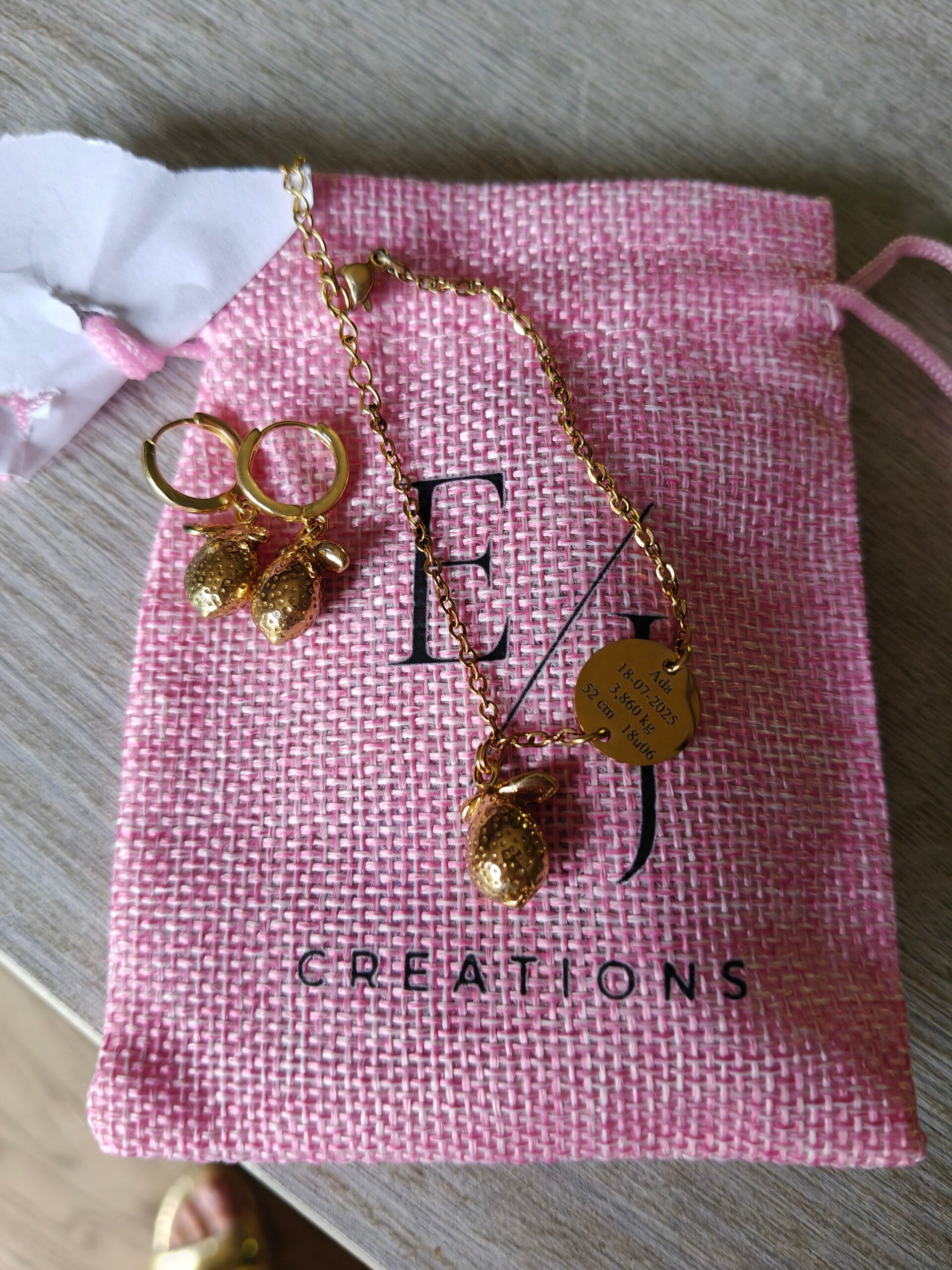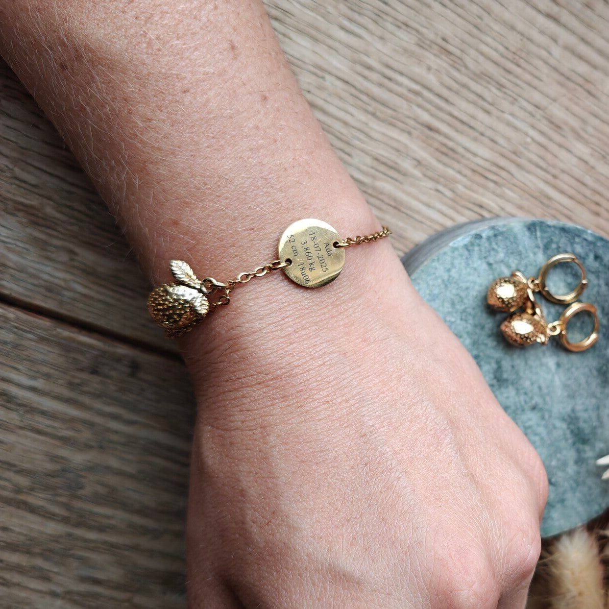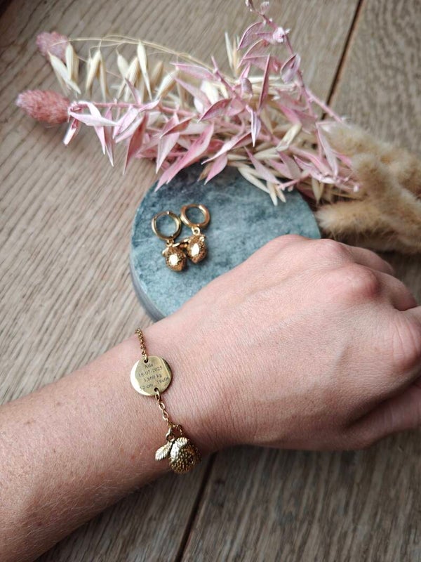 Gegraveerd armbandje + oorbel: geboortegegevens