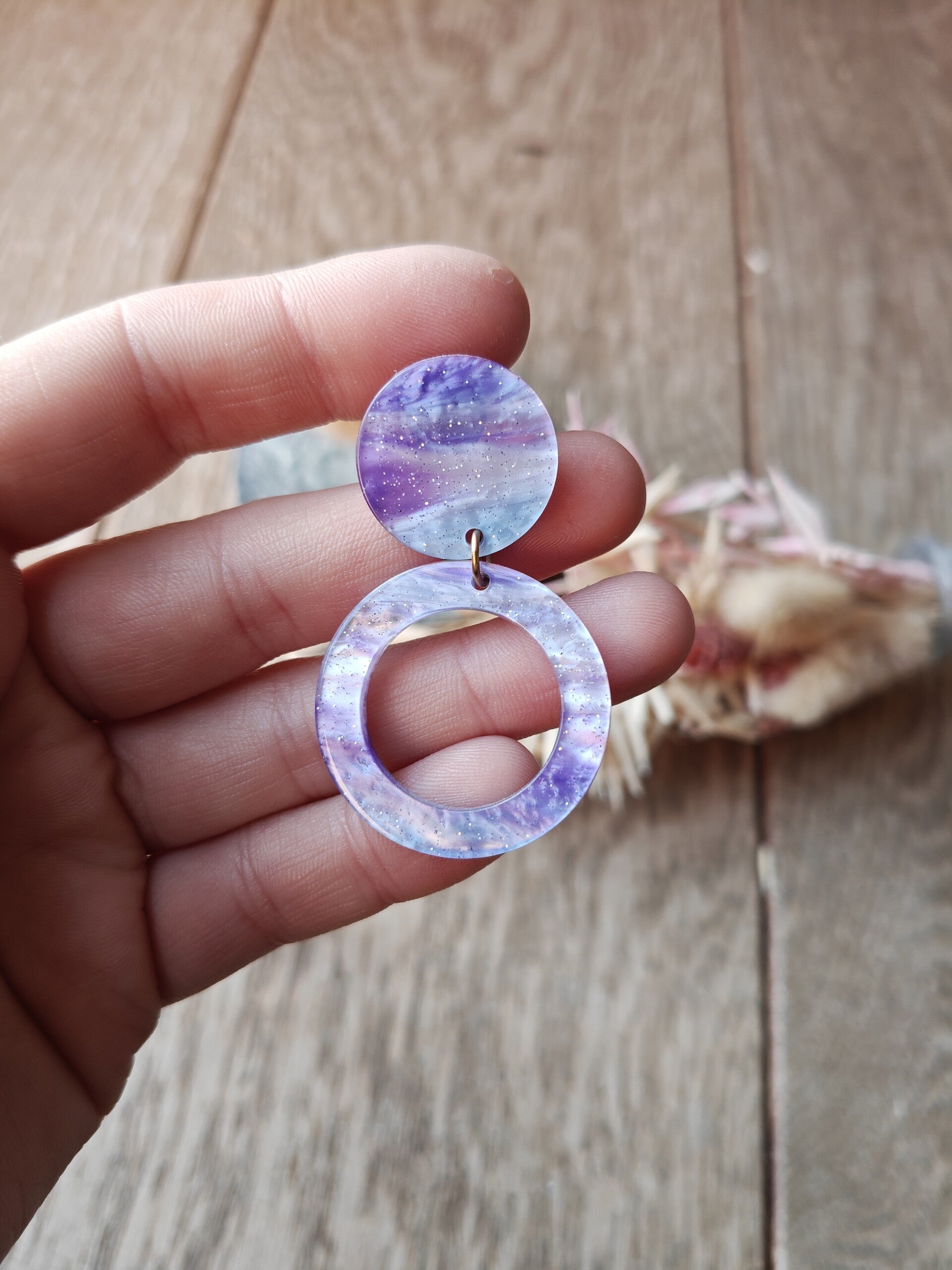 De oorbellen bestaan uit een dubbele cirkelvorm in paarse marmerlook, afgewerkt met subtiele gouden glitters die prachtig schitteren in het licht.