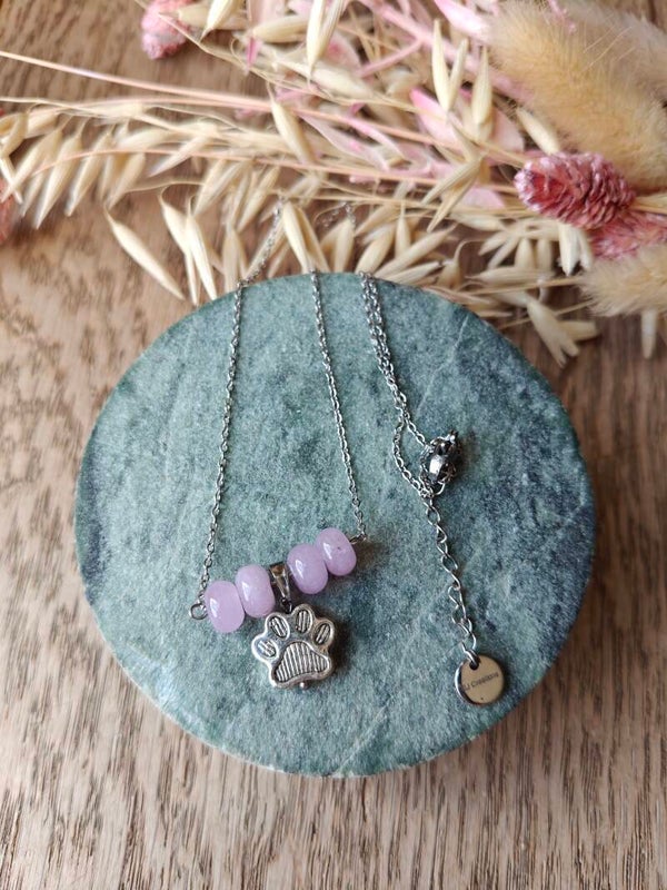 ketting met zachte lila kralen en een pootafdruk-bedeltje. Perfect voor wie een liefde voor dieren wil uitstralen – of gewoon dol is op unieke sieraden.
