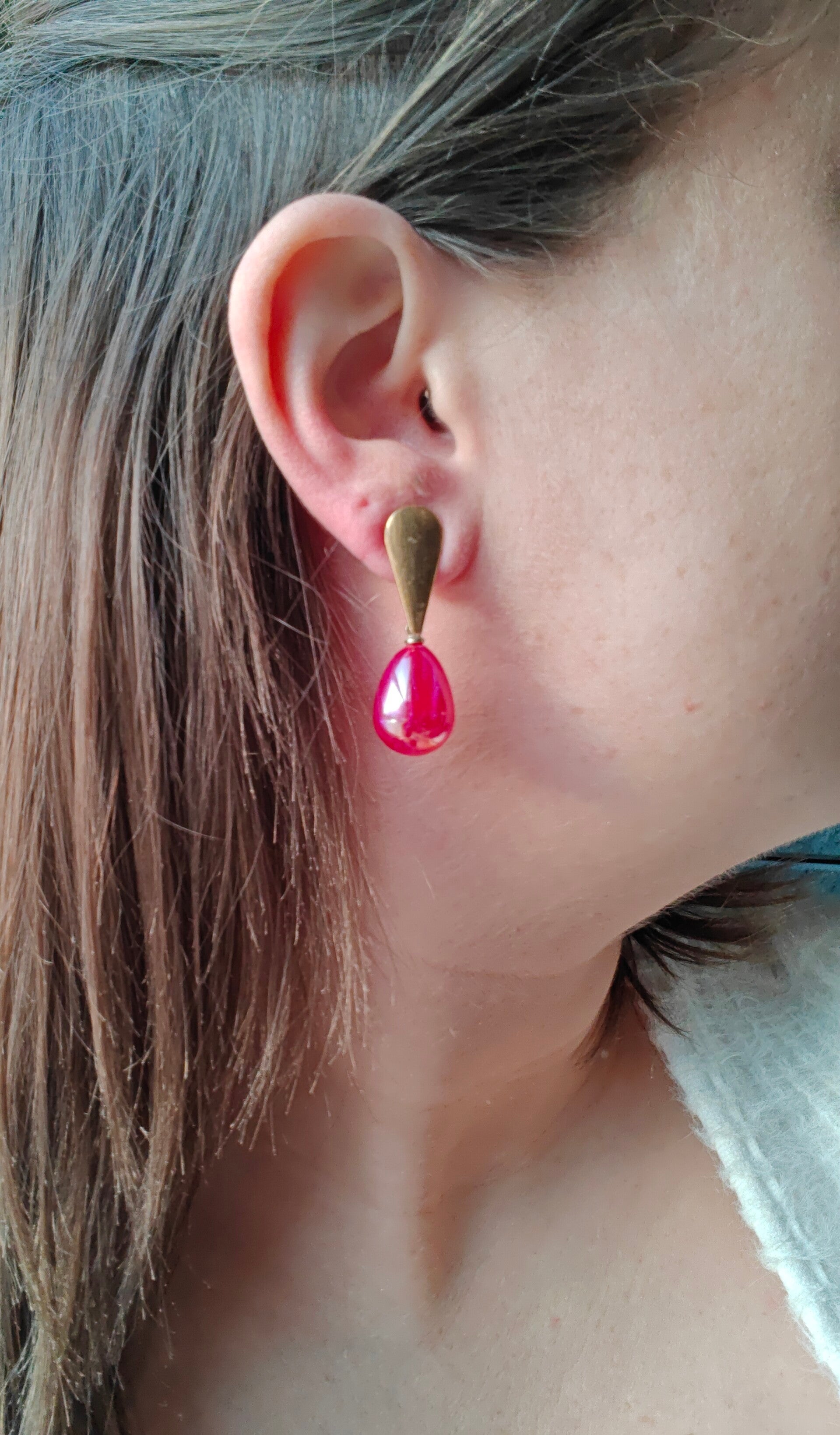 Oorbel ROZ24: kleine roze hanger met gouden prikker