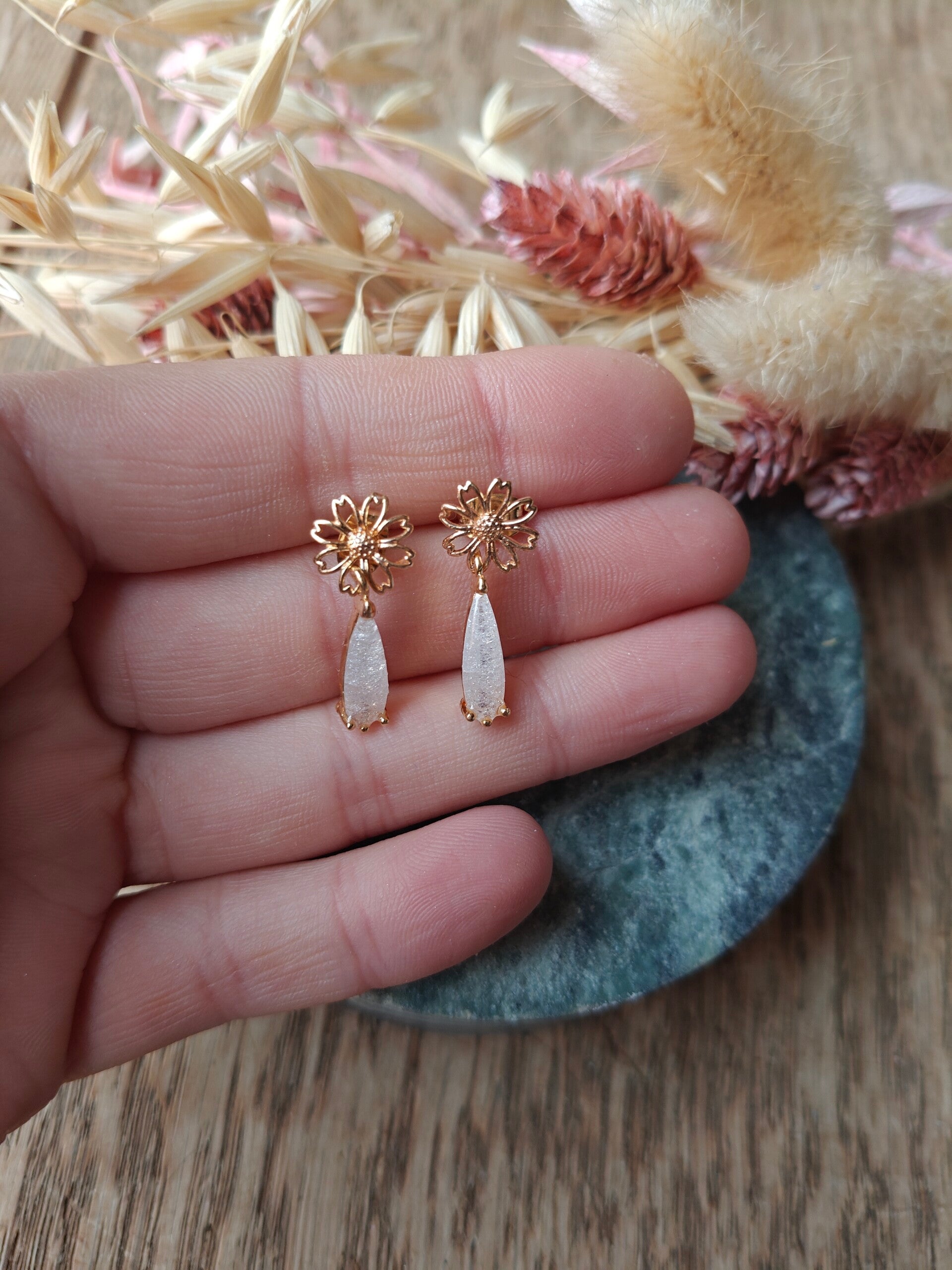 Oorbel KLEIN54: witte hanger met gouden bloempje