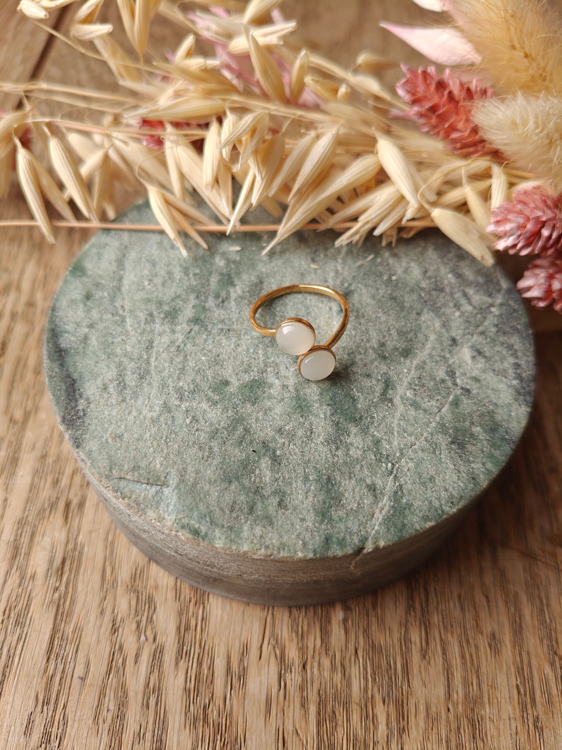 Ring W4: verstelbare witte ring met 2 steentjes