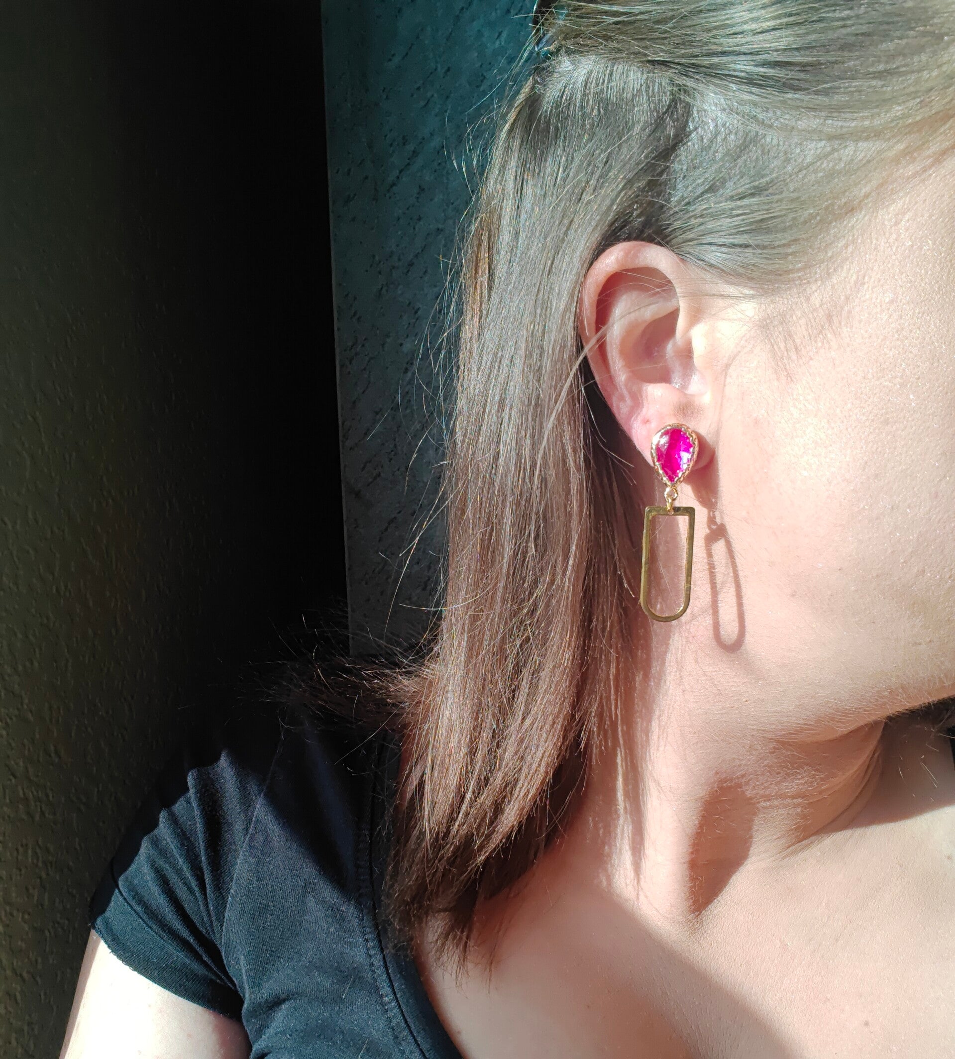 Oorbel ROZ21: felroze prikker met goudkleurige hanger