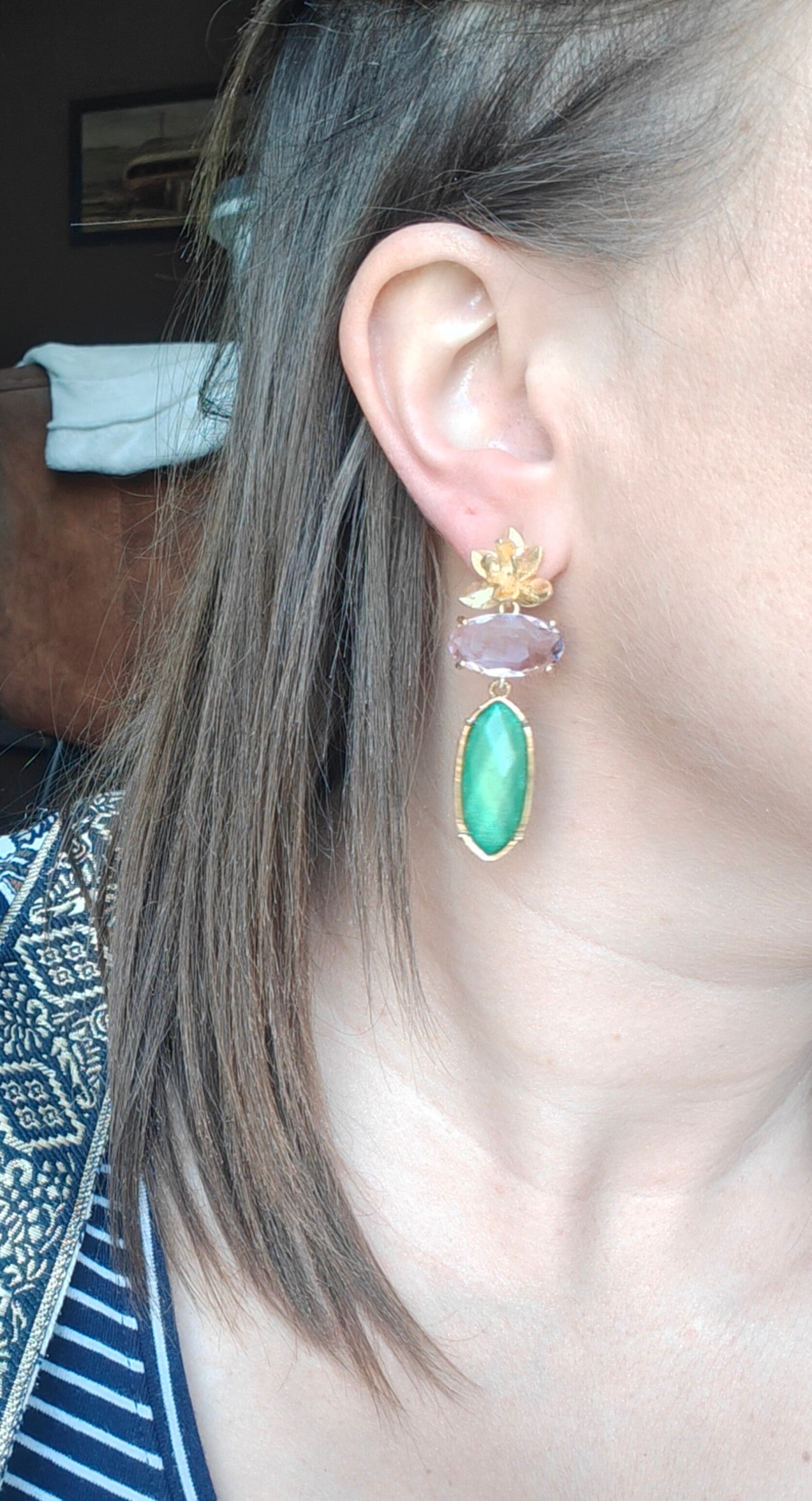 Oorbel: GRO16: groene hanger met licht roos steentje