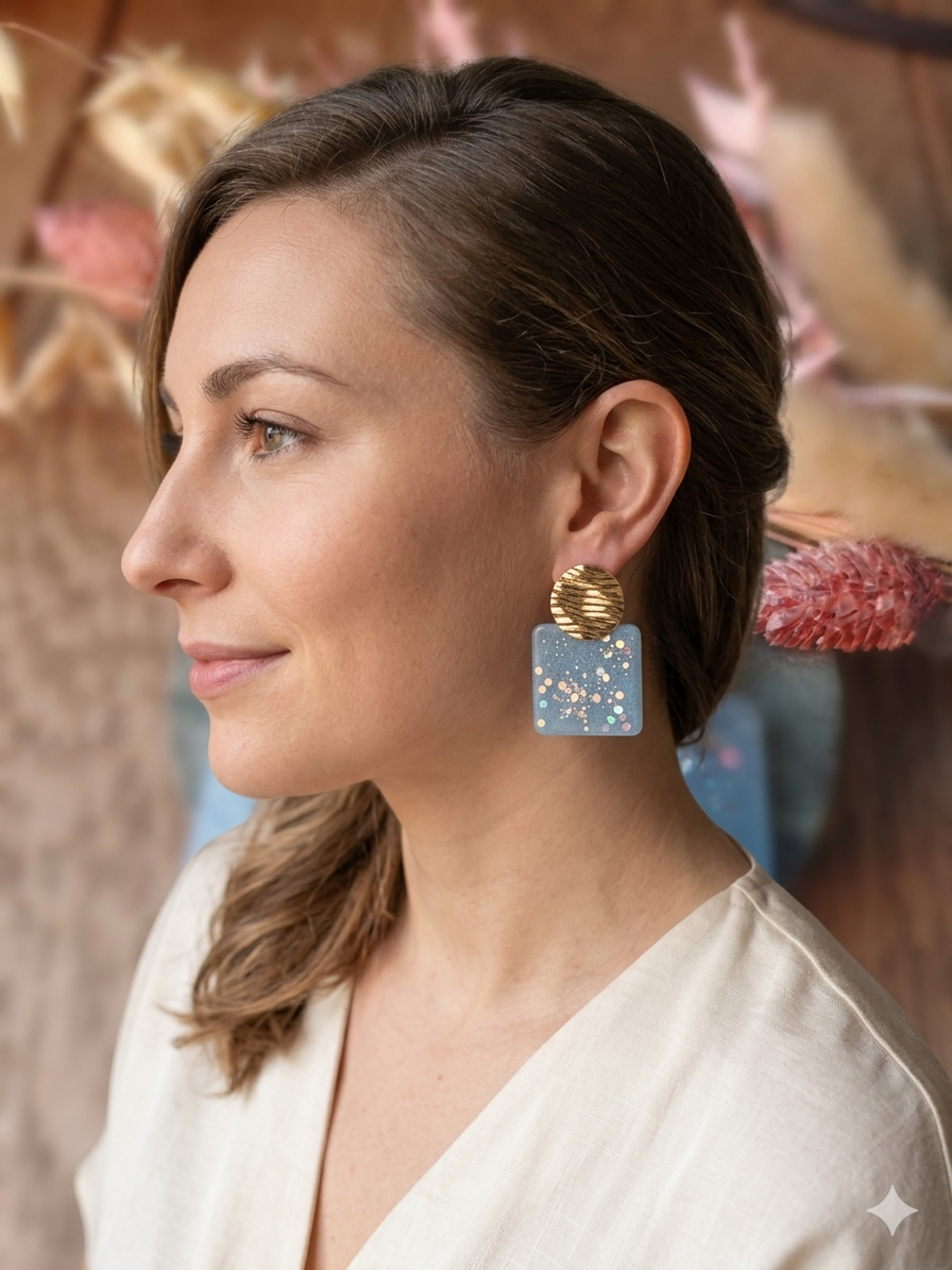 Oorbel UITVERKOOP 24: blauwe glitter hanger met gouden prikker